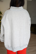 A classic heather gray mockneck that is reversible--2 in 1!! Featuring a drop shoulder, and a super cozy fleece lining with an oversized and comfy fit.