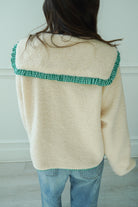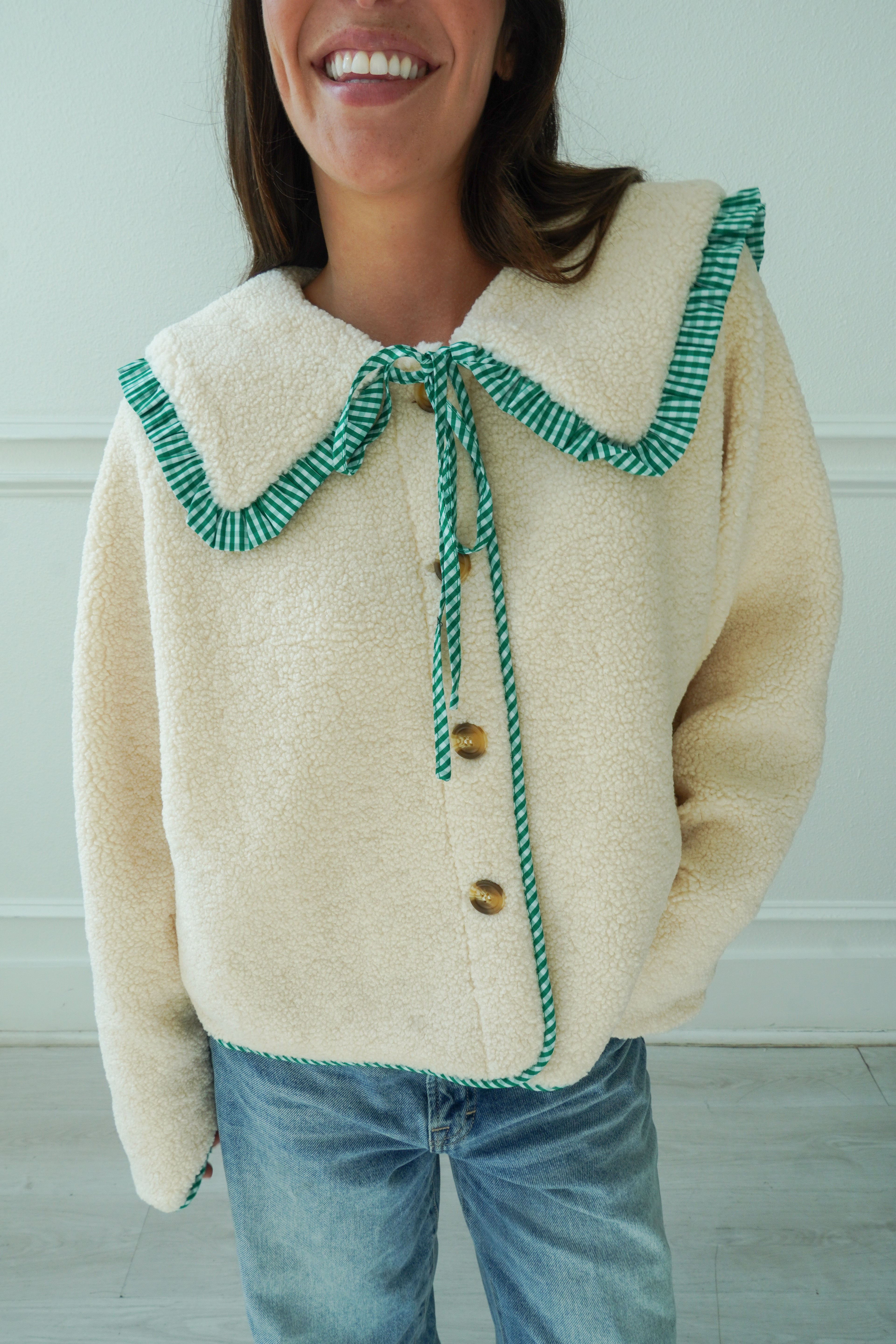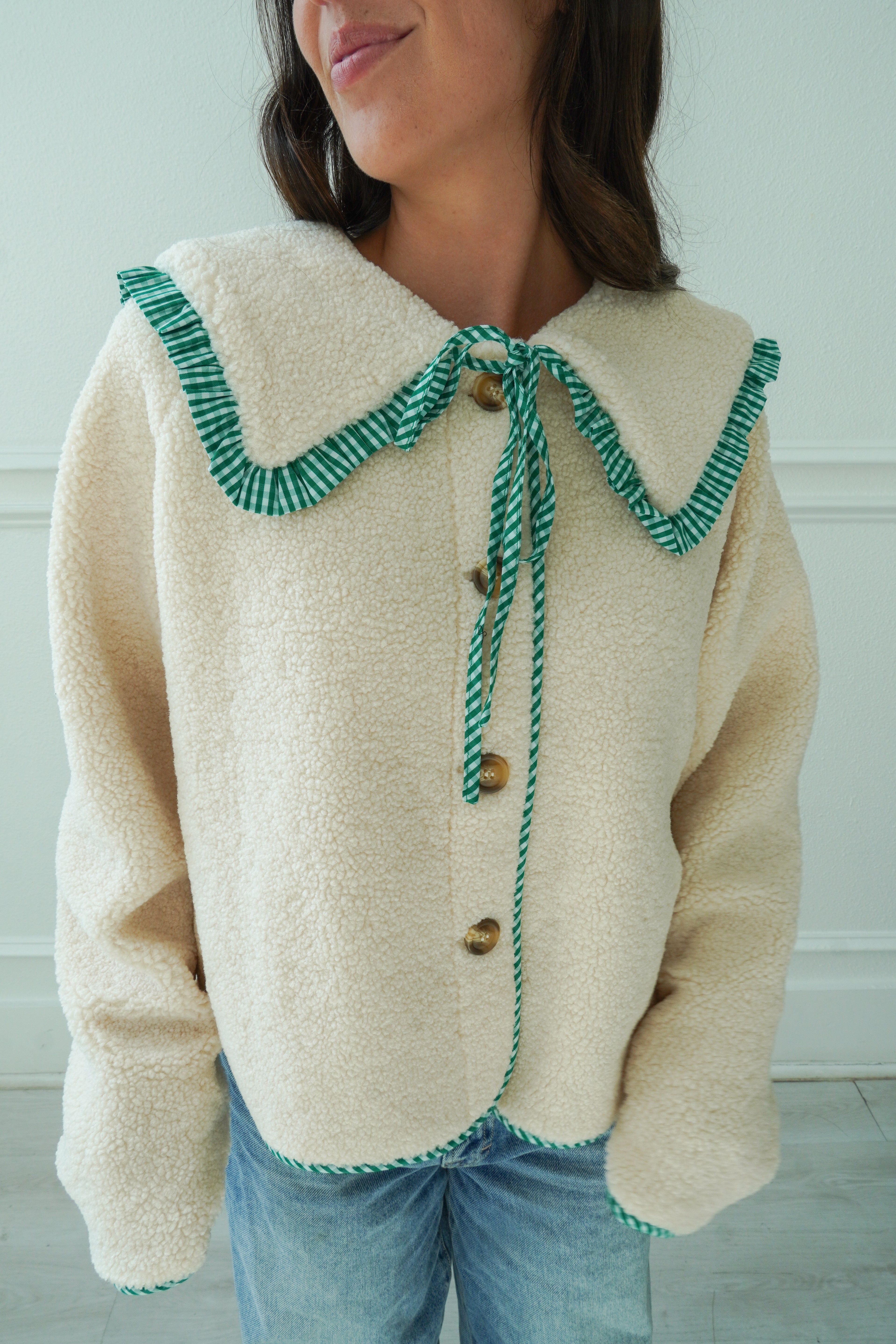 Girly meets cozy! Featuring a ruffled gingham peter pan collar and the coziest sherpa teddy fabric, this jacket is everything you could ask for! We are obsessed with the slightly oversized and cozy fit.