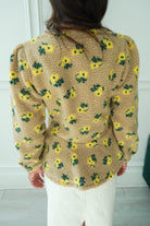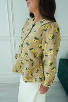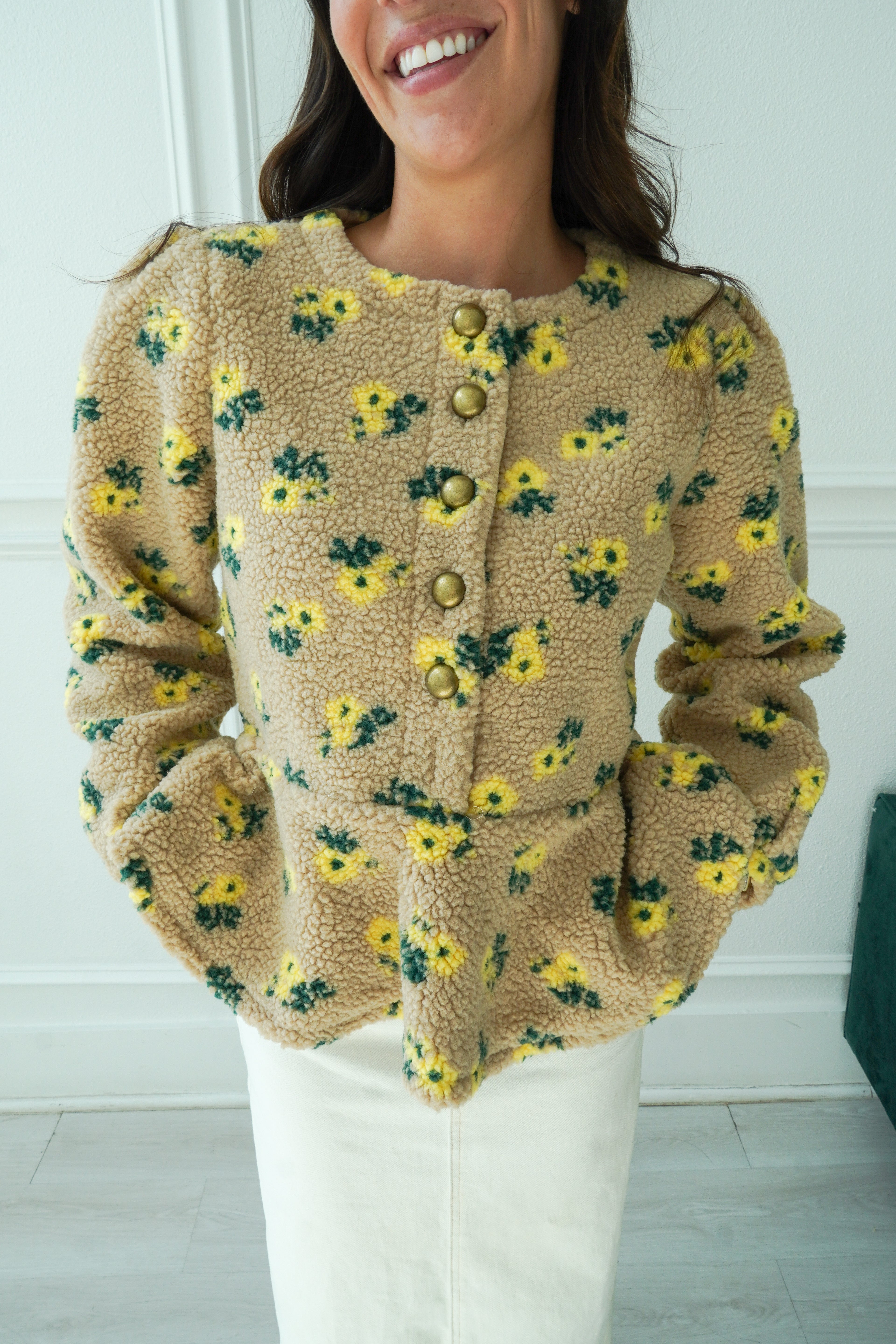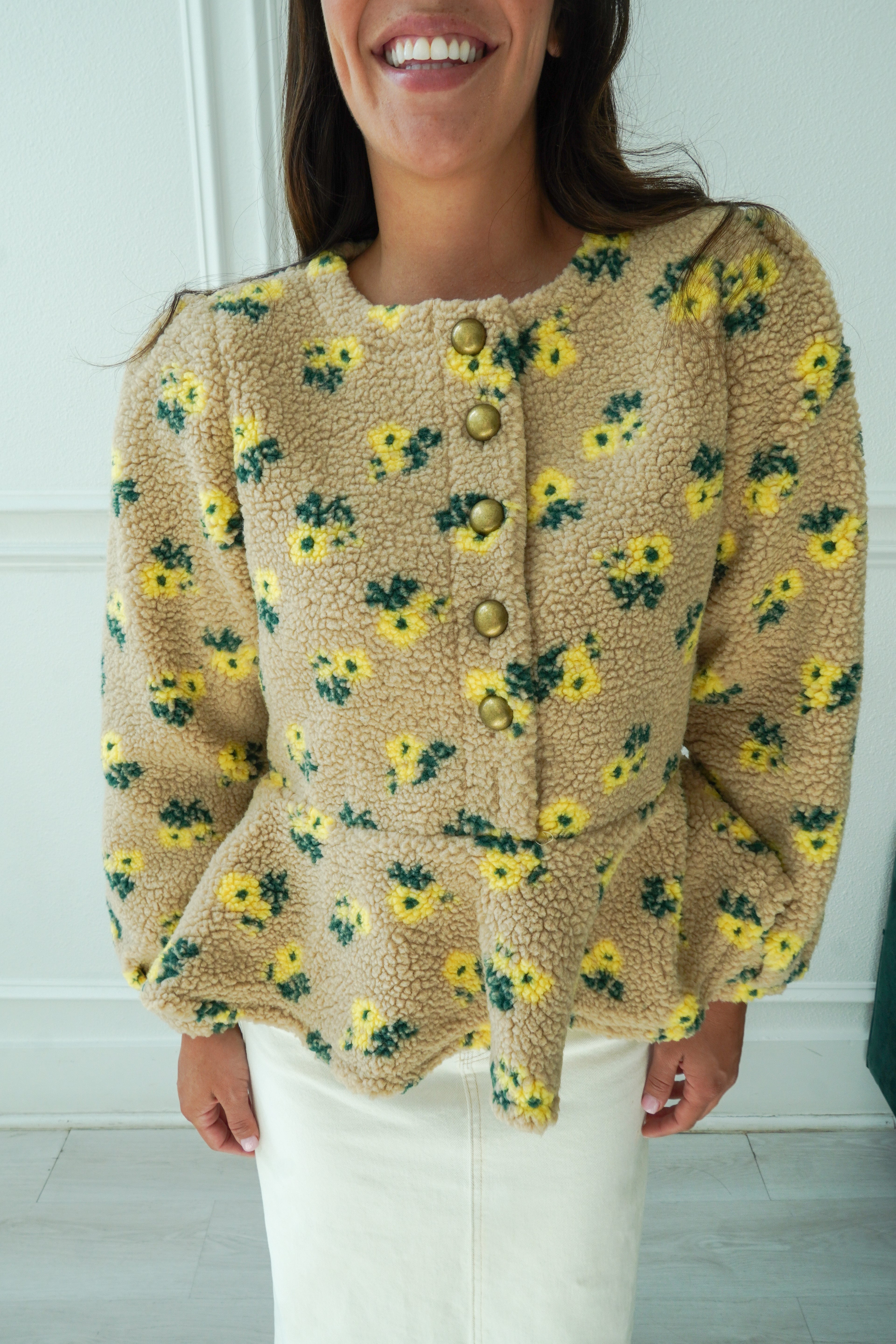 Featuring a yellow and green girly floral print and a sherpa teddy fabric, this jacket is adorable for work, or a girls night out! We love the gold chunky accents for the buttons and the peplum hem! So flirty and fun!