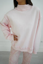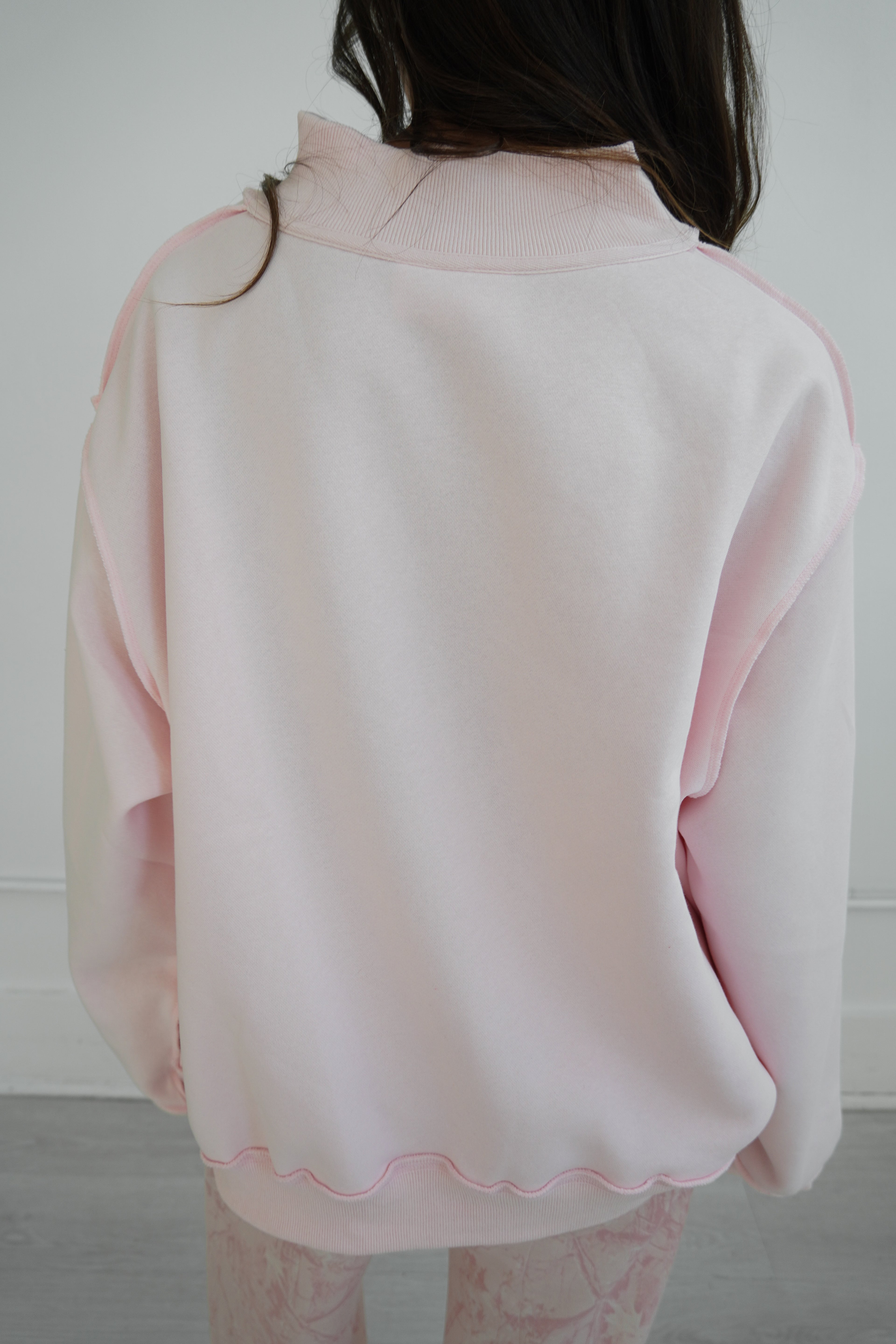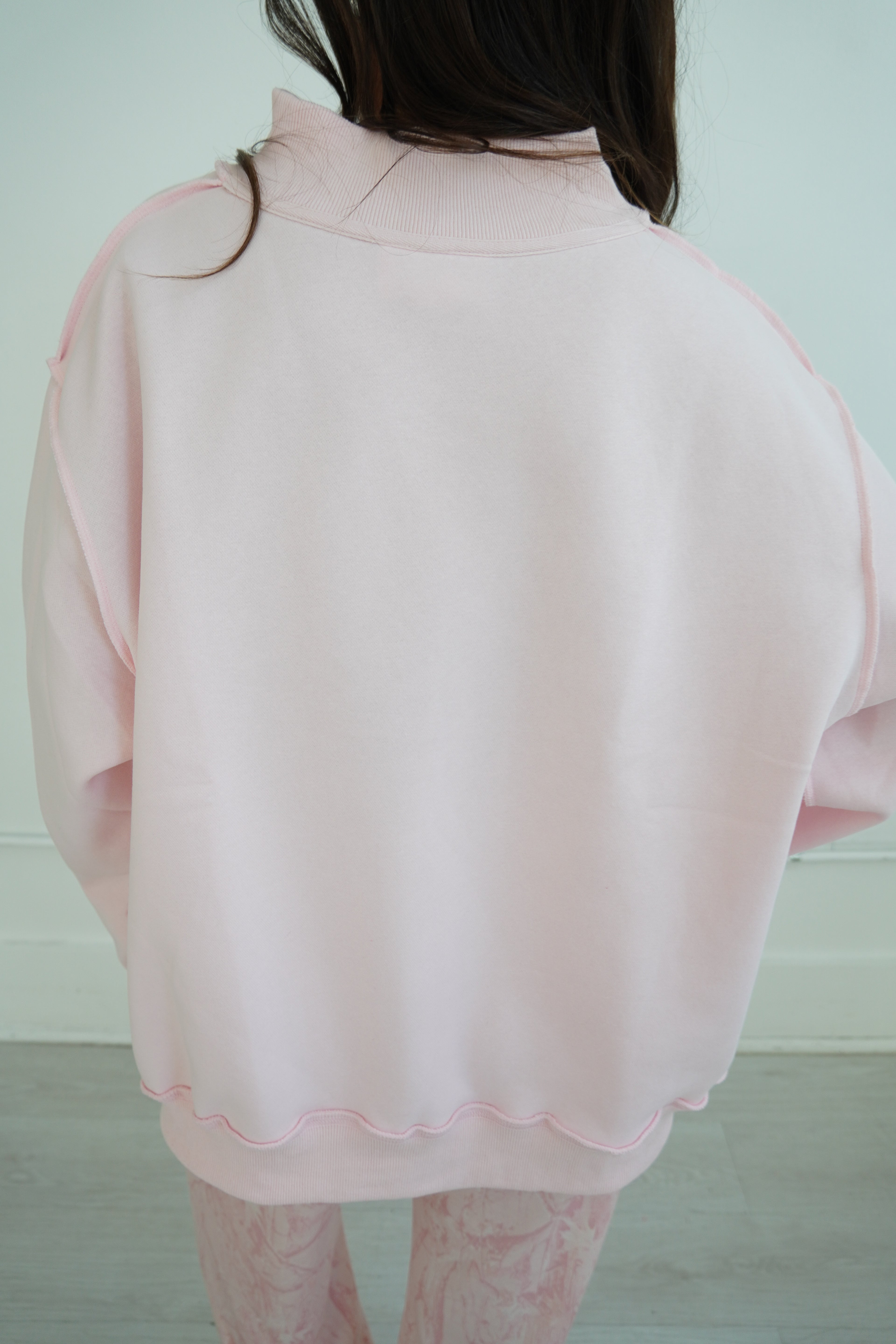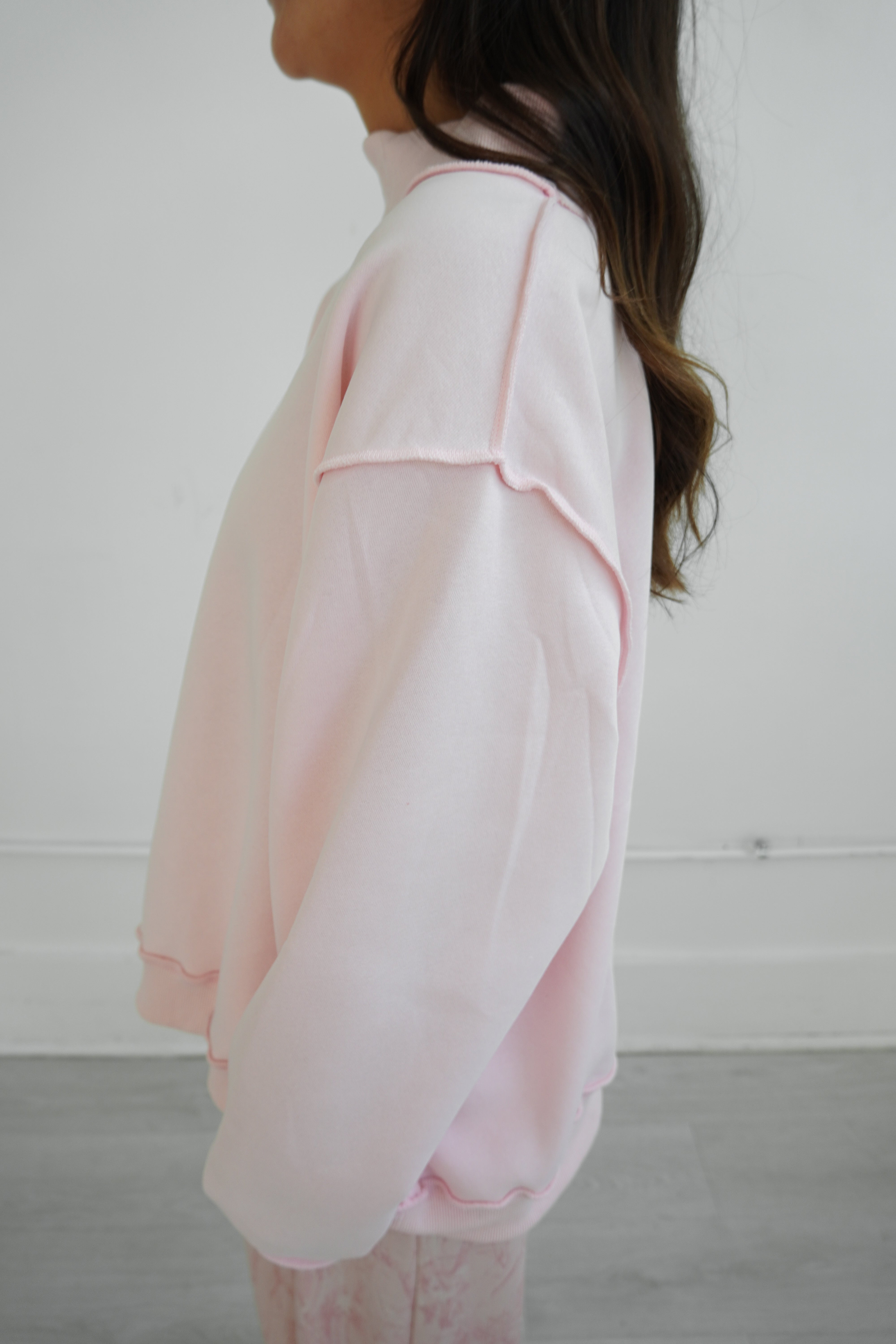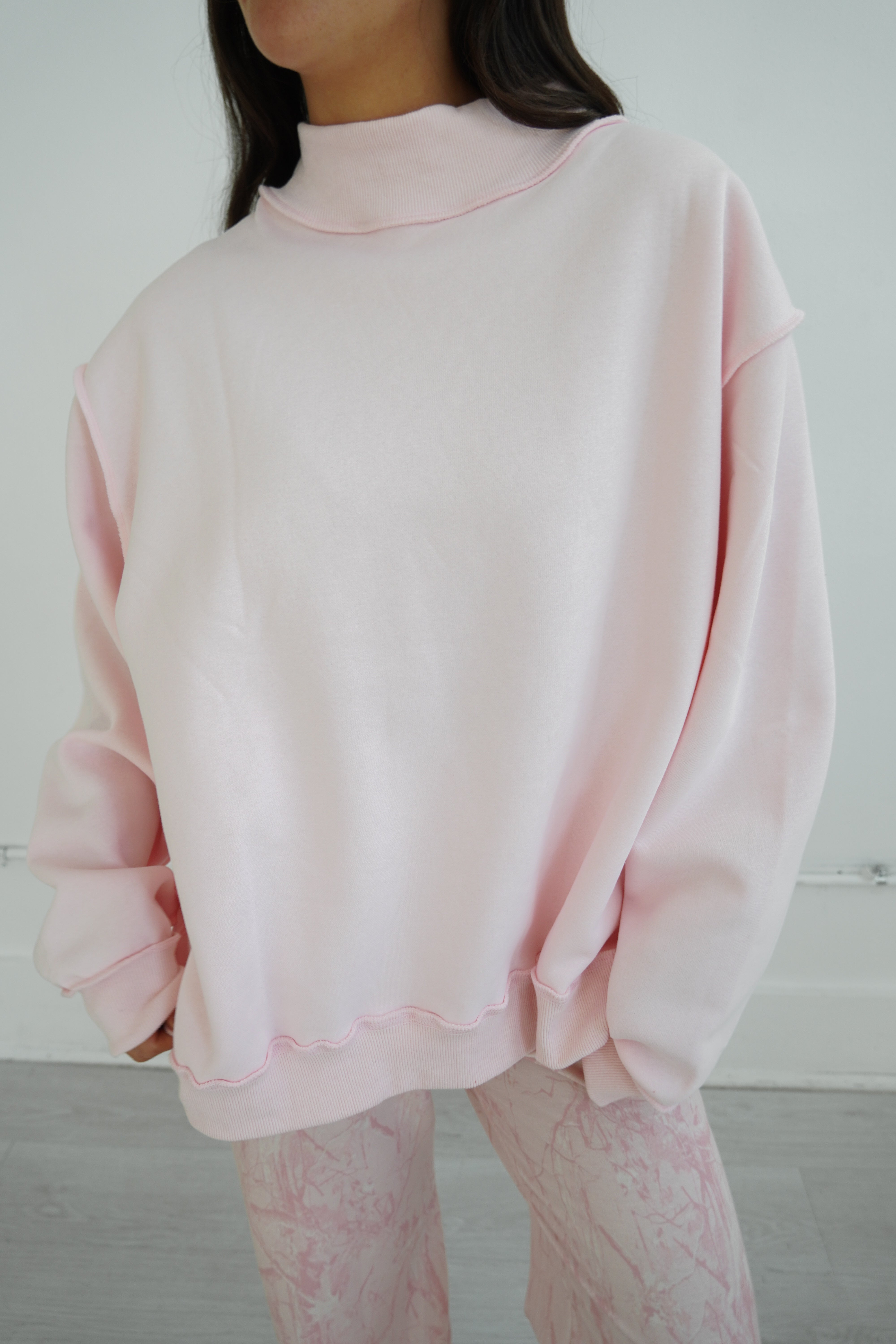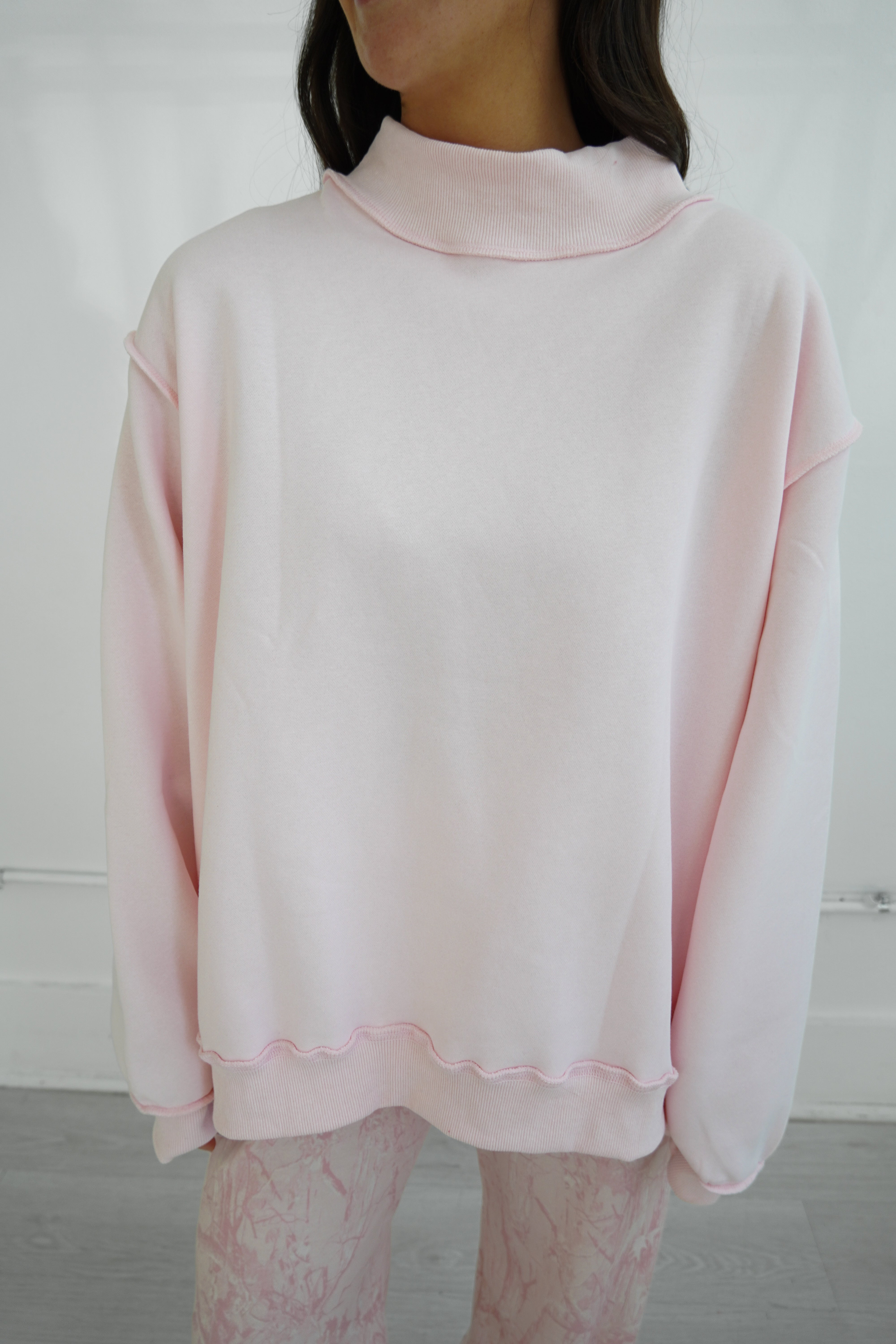 A classic baby pink mockneck that has an inside out look because of the seams! Featuring a drop shoulder, and a super cozy fleece lining with an oversized and comfy fit.