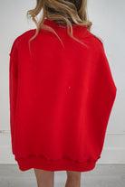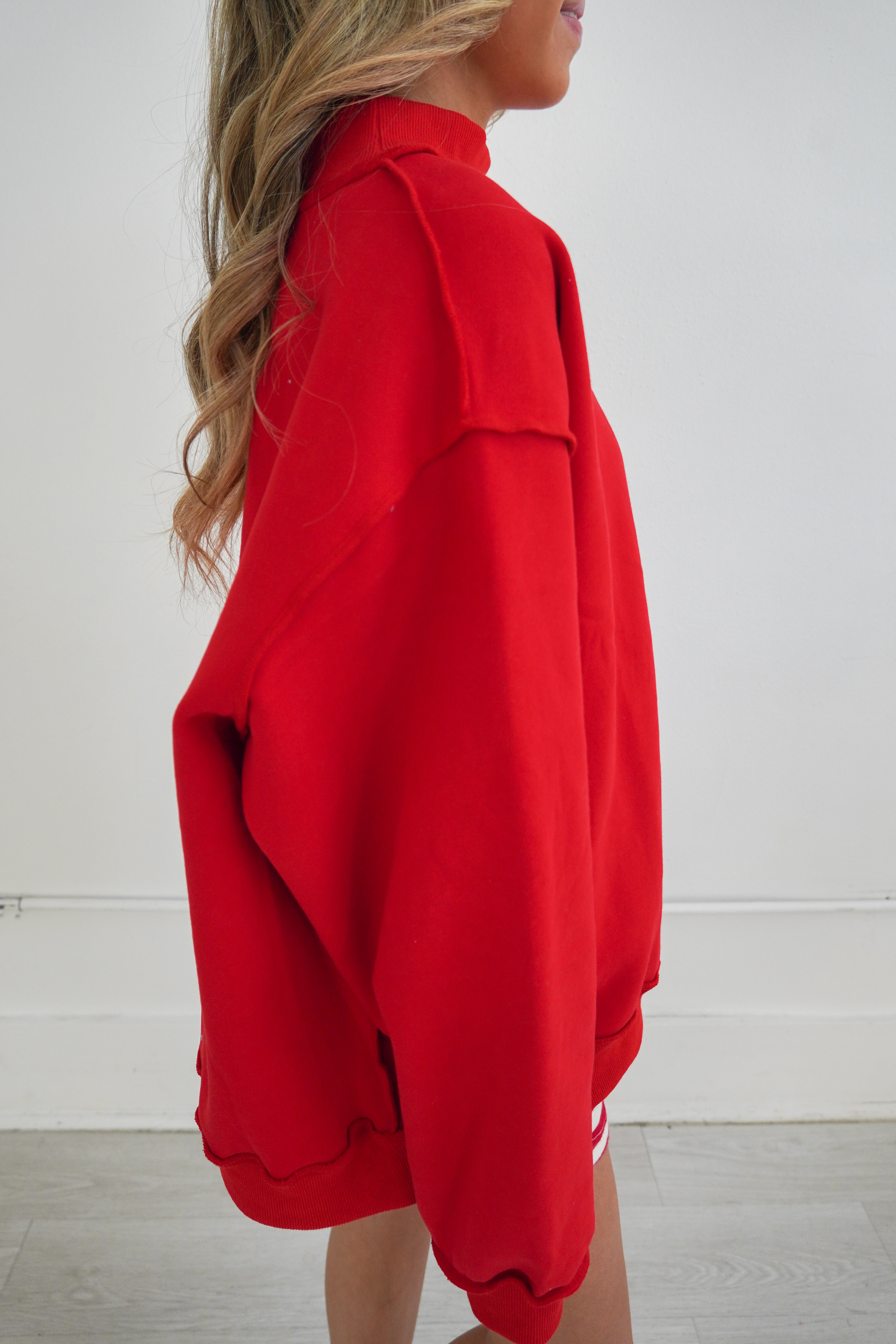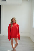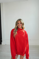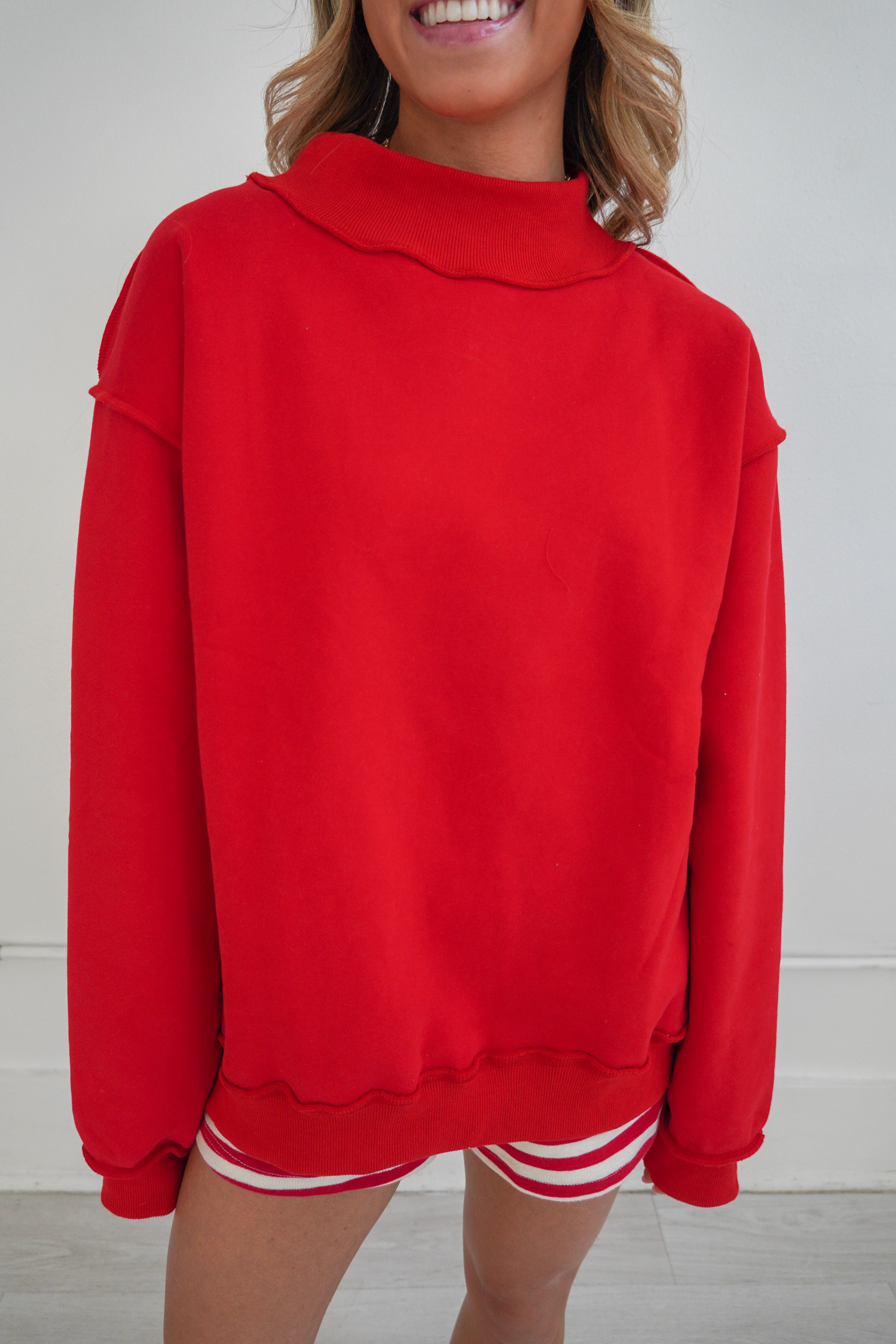 A classic red mockneck that has an inside out look because of the seams! Featuring a drop shoulder, and a super cozy fleece lining with an oversized and comfy fit.