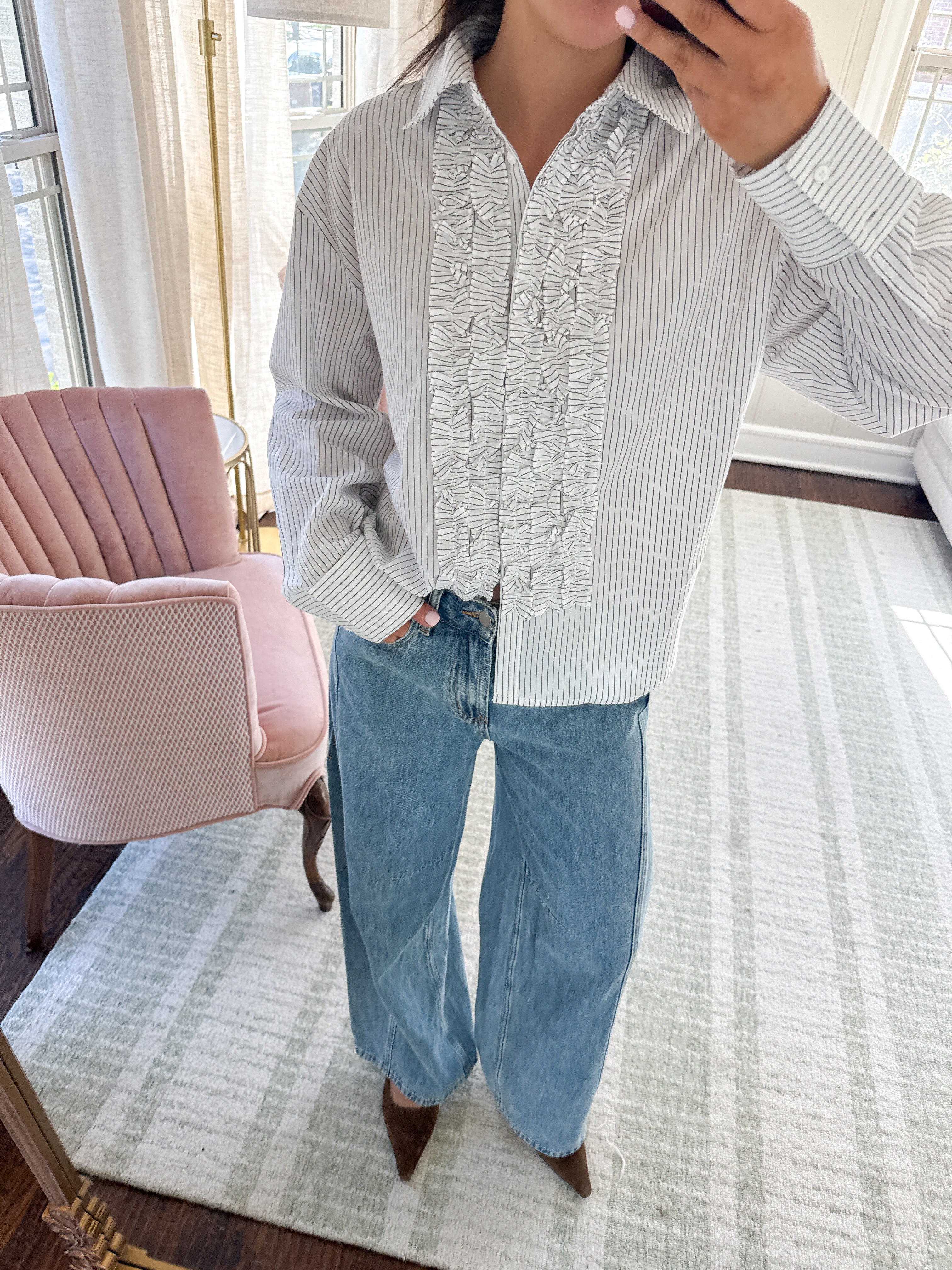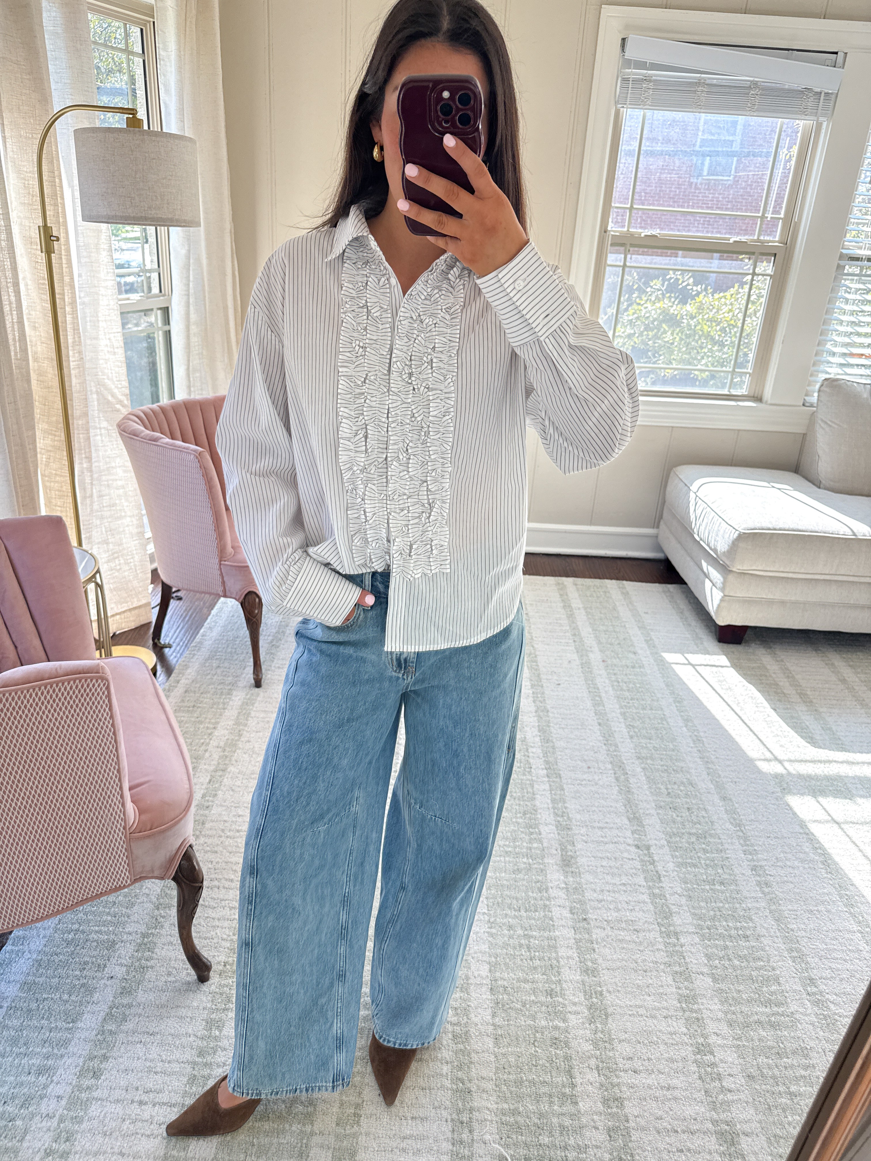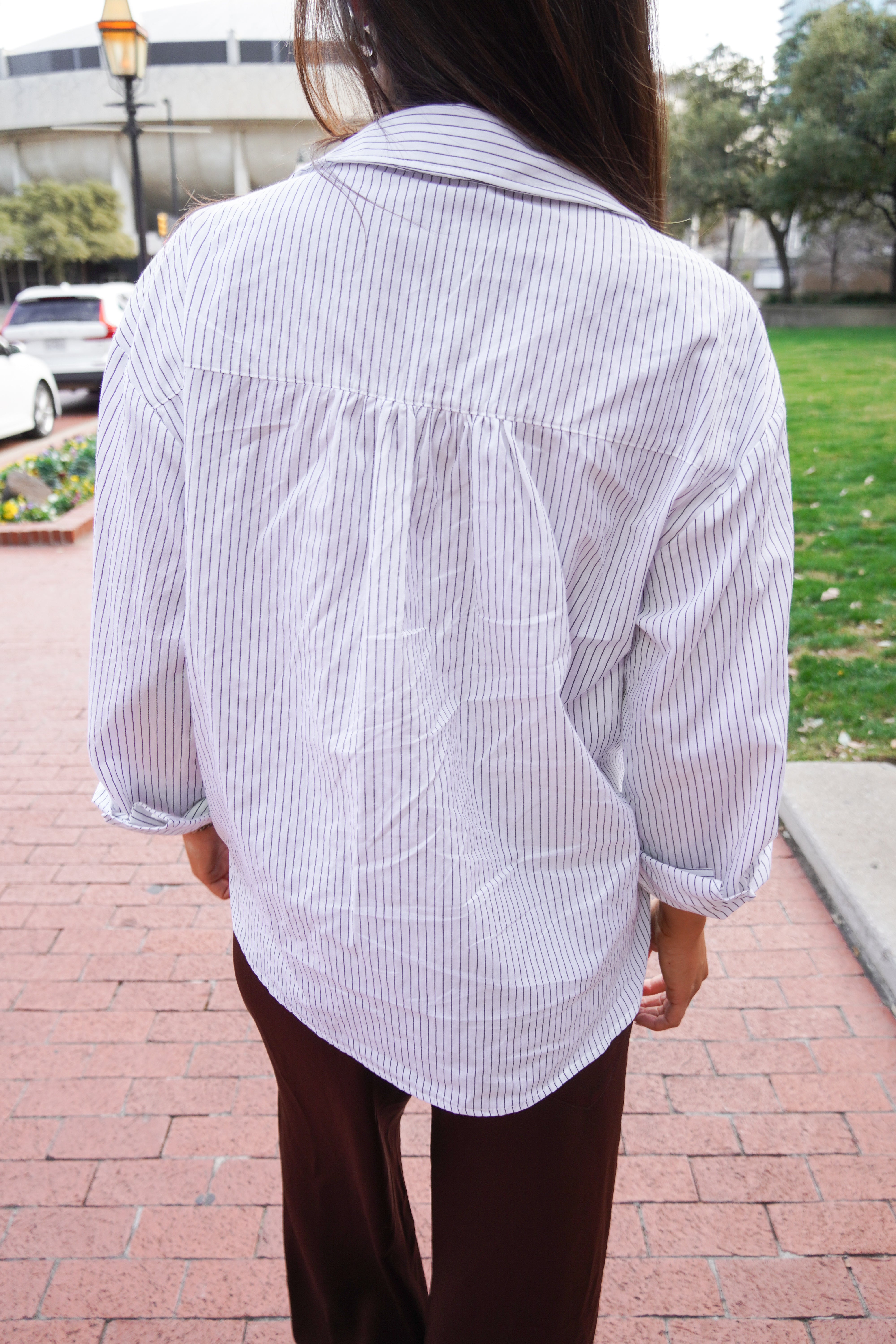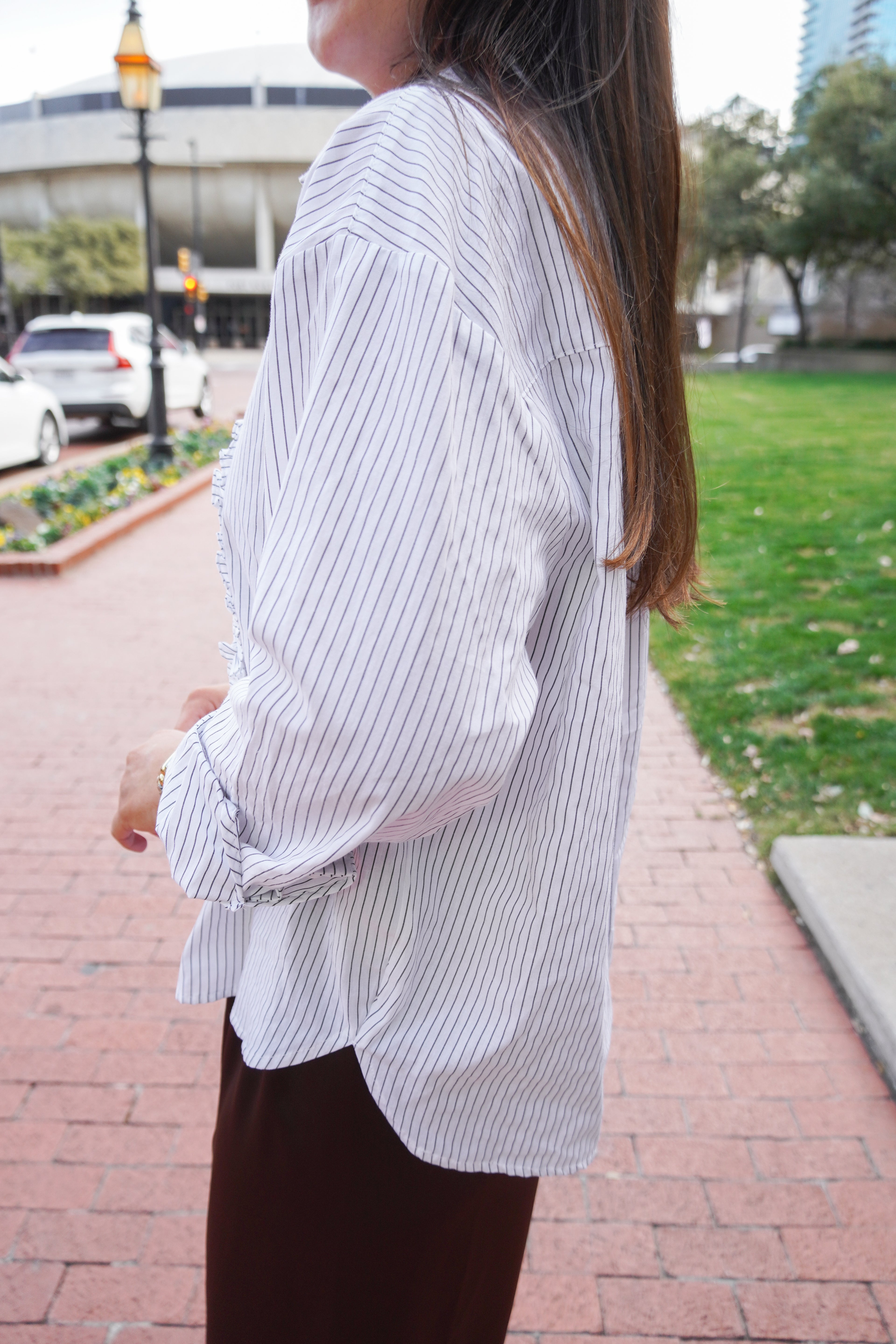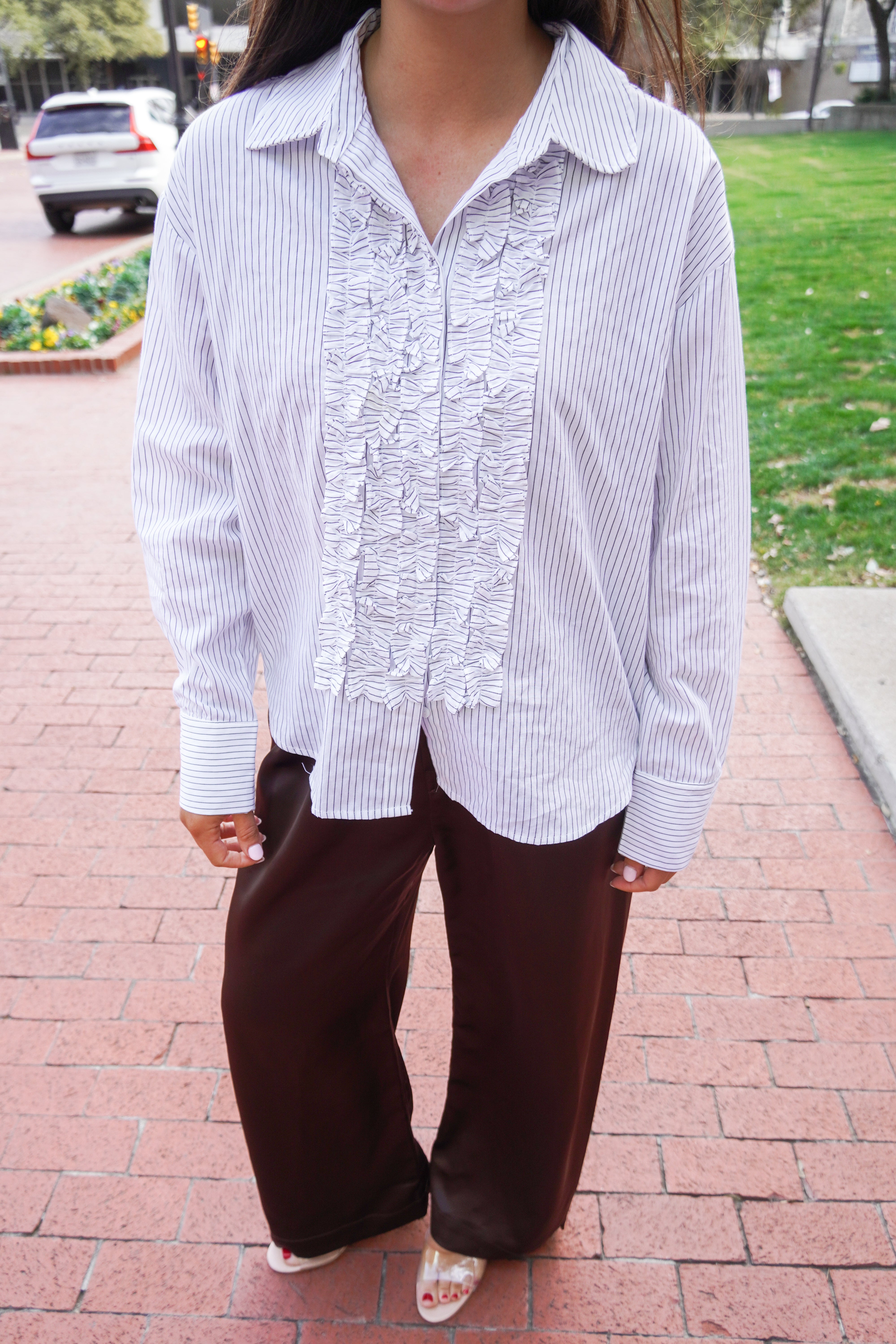 Elevate your everyday style with this button-up featuring delicate ruffles that frame the front placket with a playful touch. The crisp fine stripe print adds timeless appeal, while the classic silhouette works seamlessly from office to weekend brunch. Versatile, flattering, and fun-- this top is guaranteed to be worn on repeat.