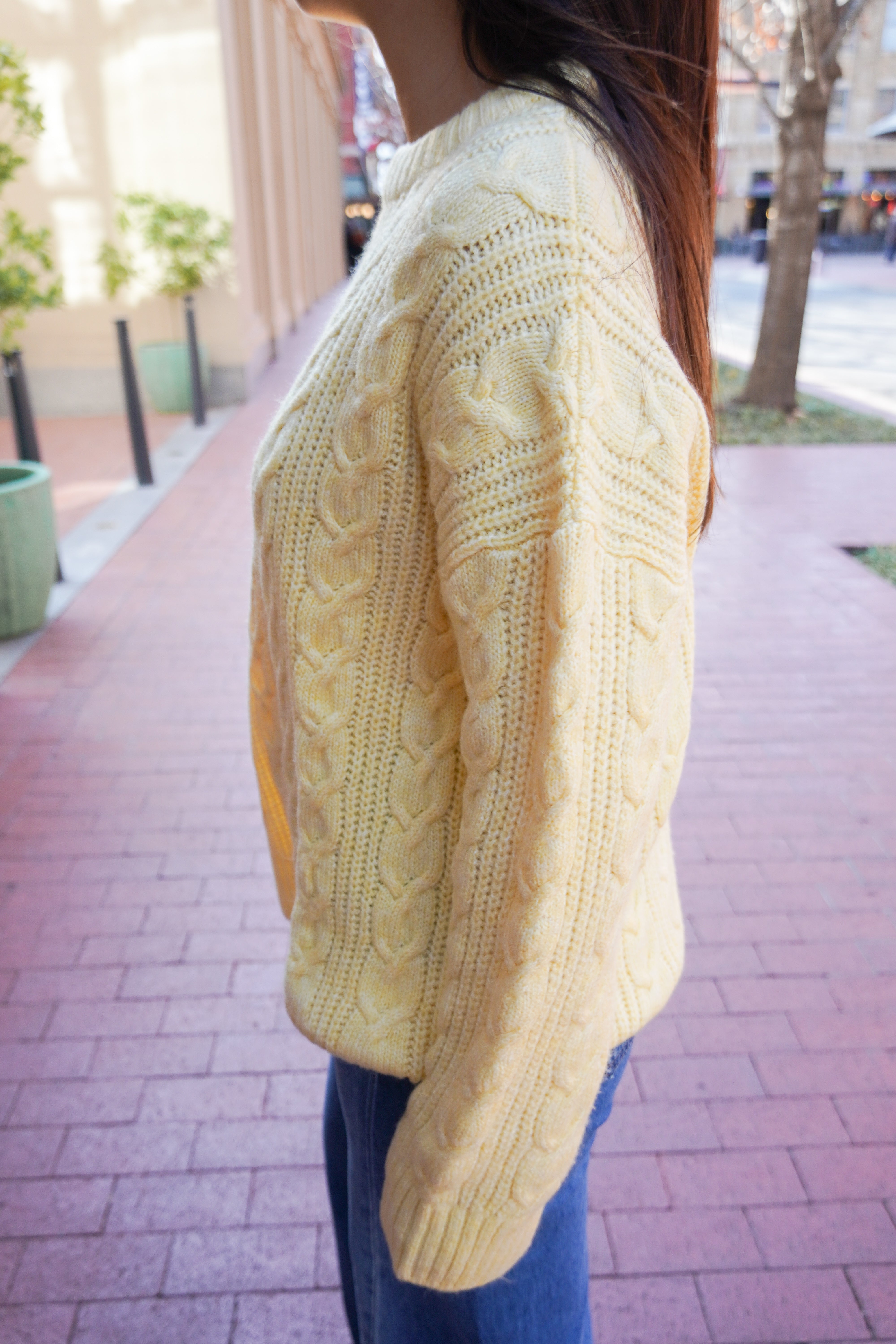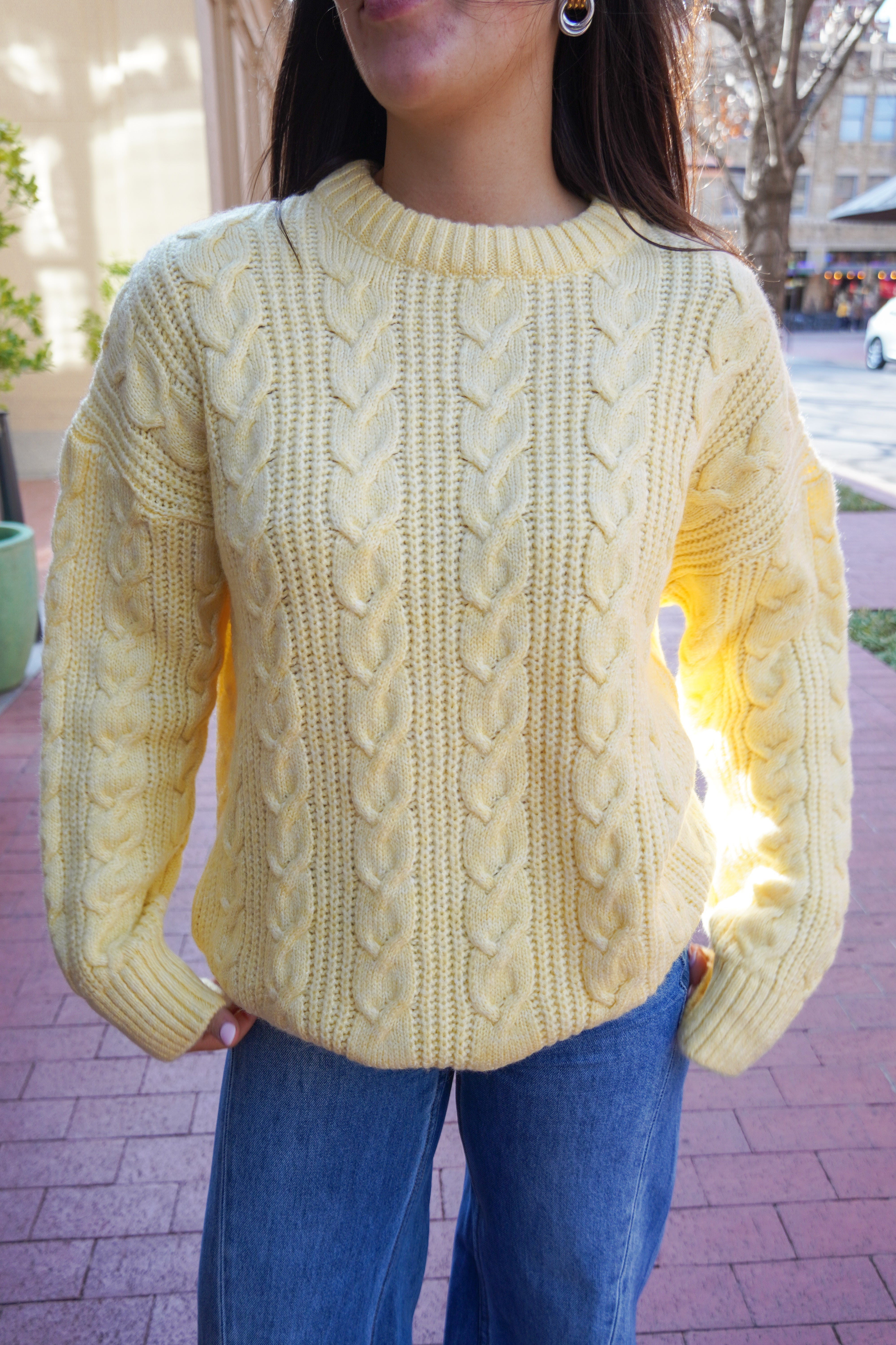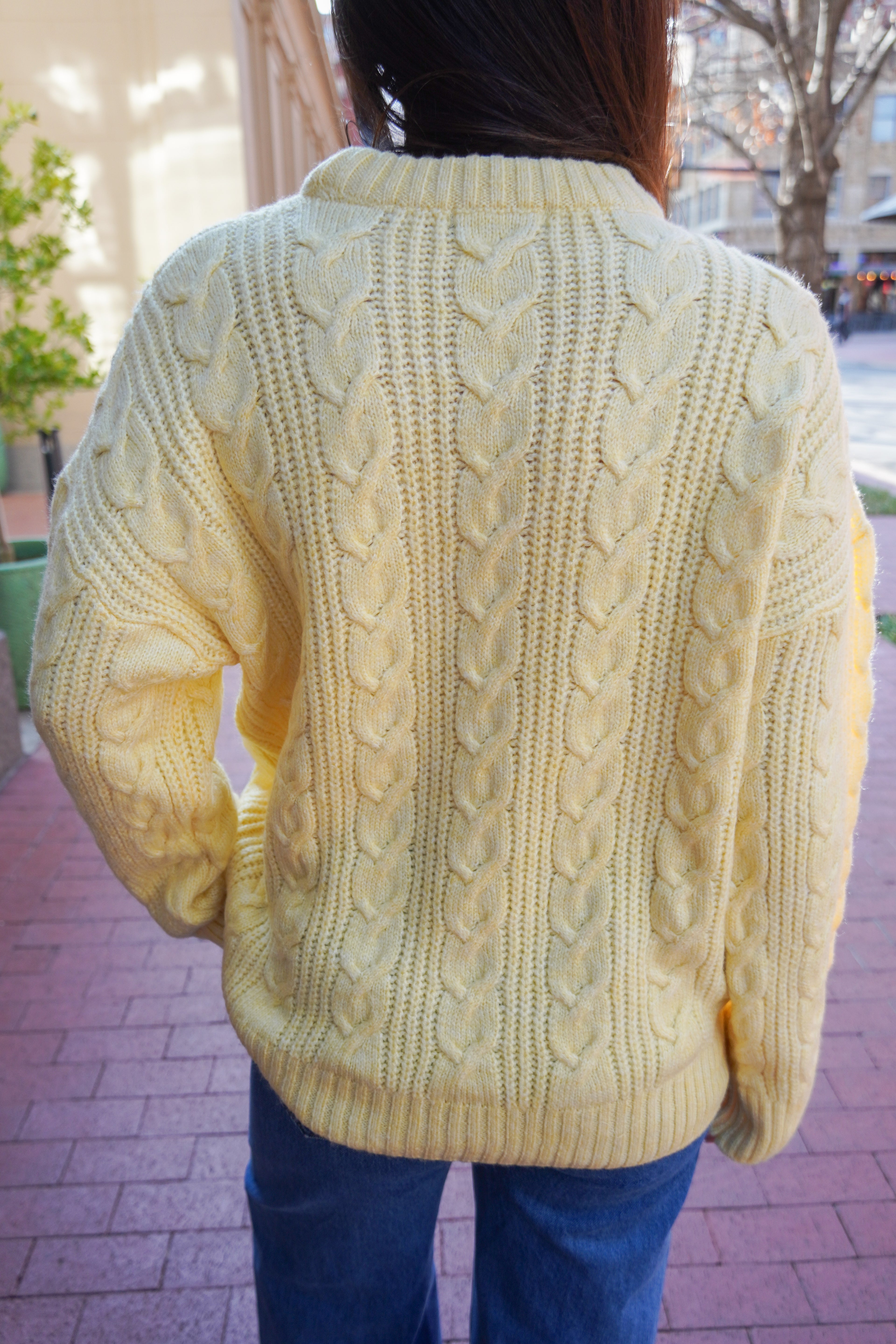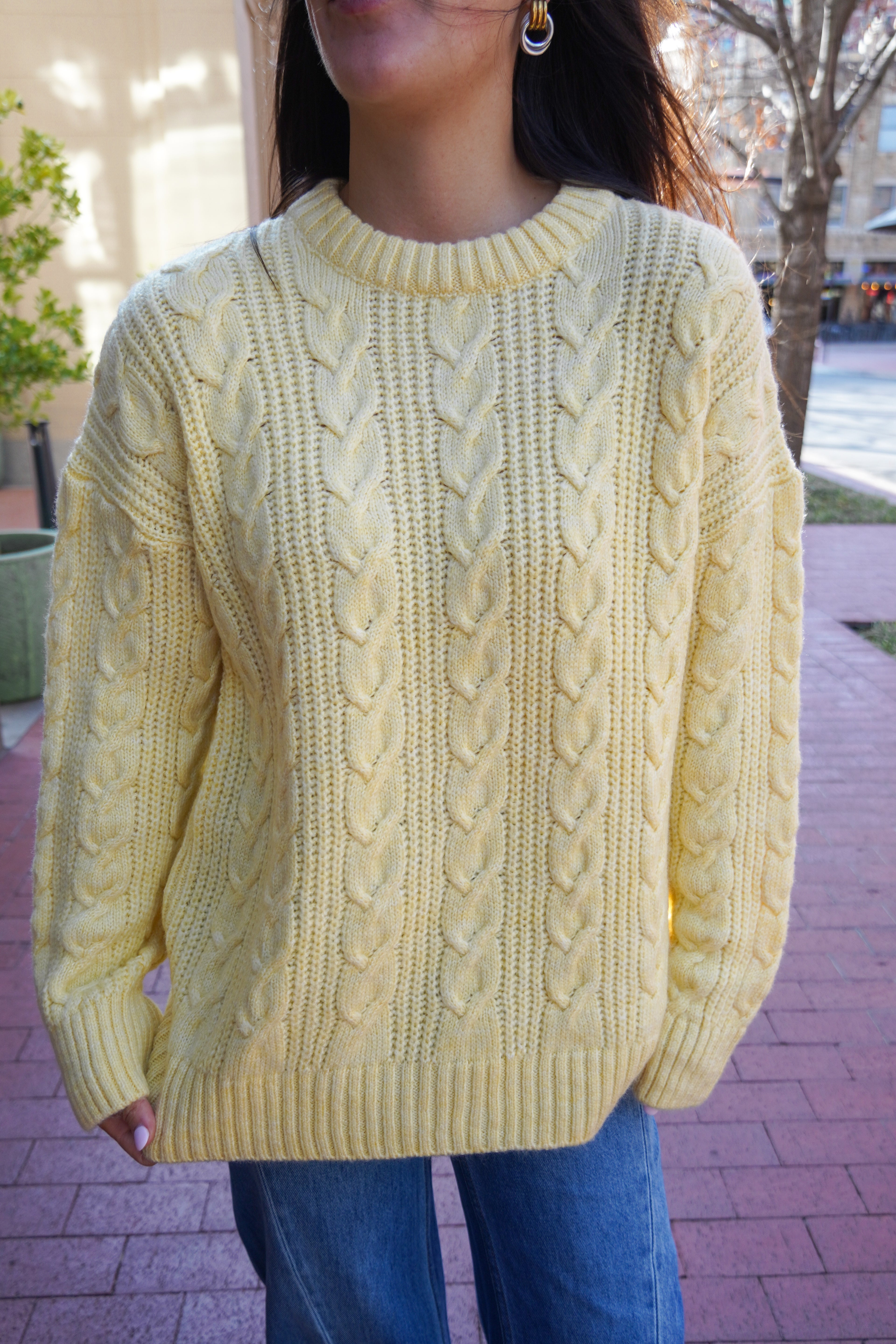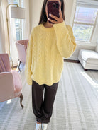Featuring a chunky cable knit and a cozy oversized fit-- this sweater makes for endless styling options and an effortless look. Warm, cozy, and the perfect butter yellow color.