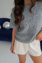 This short sleeve gray fuzzy sherpa-like sweater is the perfect blend of cozy and casual. Made from ultra-soft, plush fabric that mimics the warmth and comfort of sherpa, it feels like a blanket on your skin. The neutral gray color adds versatility, while the fuzzy texture elevates your look. Perfect for lounging at home or styling up with jeans for a day out!