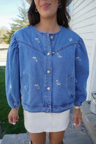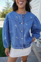 Featuring a denim puff long sleeve, round neck, buttoned up front, and embroidered flower detailing throughout that makes is so precious, this top is adorable and so perfect for styling up or down all year long.
