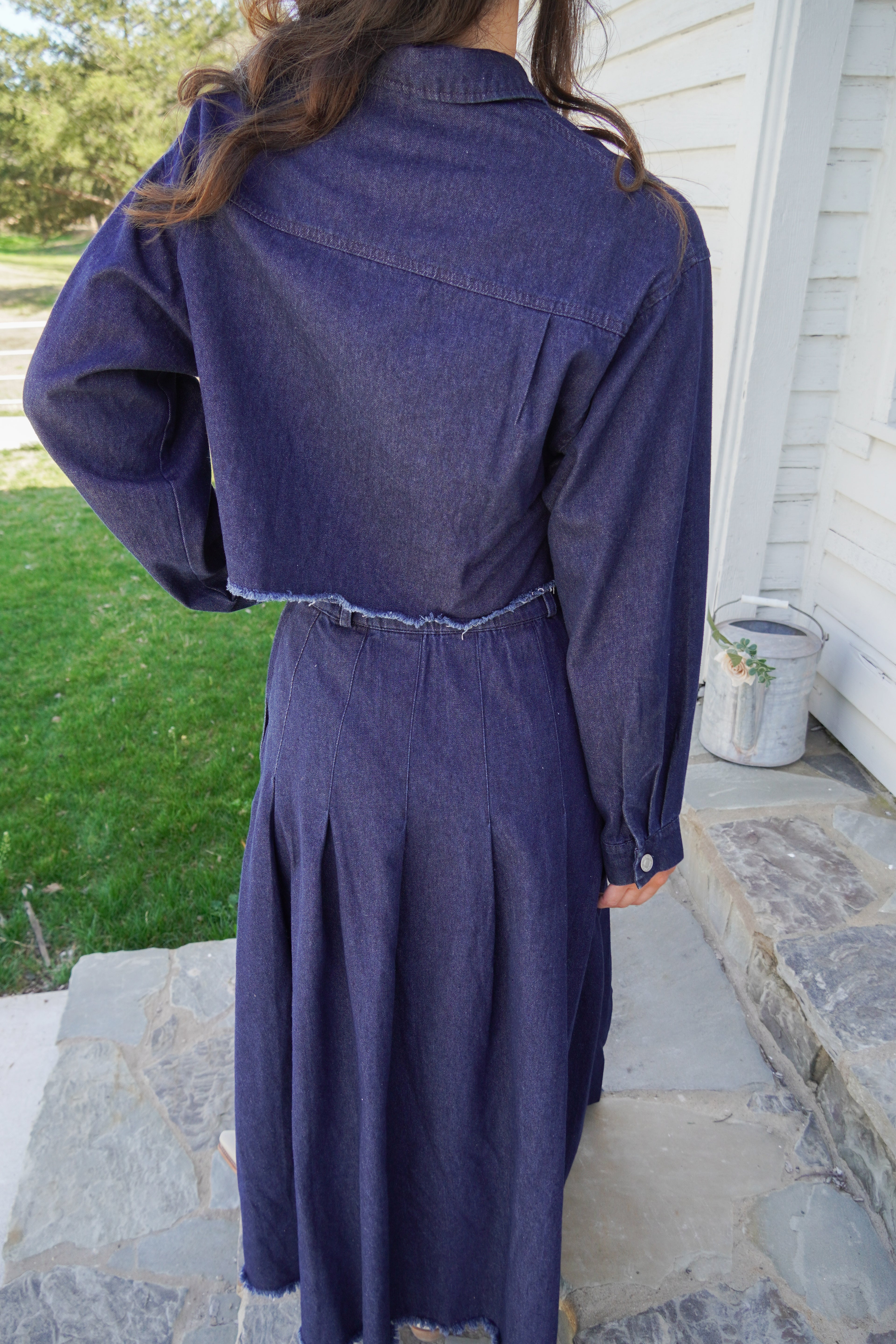 Featuring a boxy cropped top with a frayed raw hem, paired with a pleated high waisted maxi skirt-- this dark wash denim set is so chic and versatile all year long!!