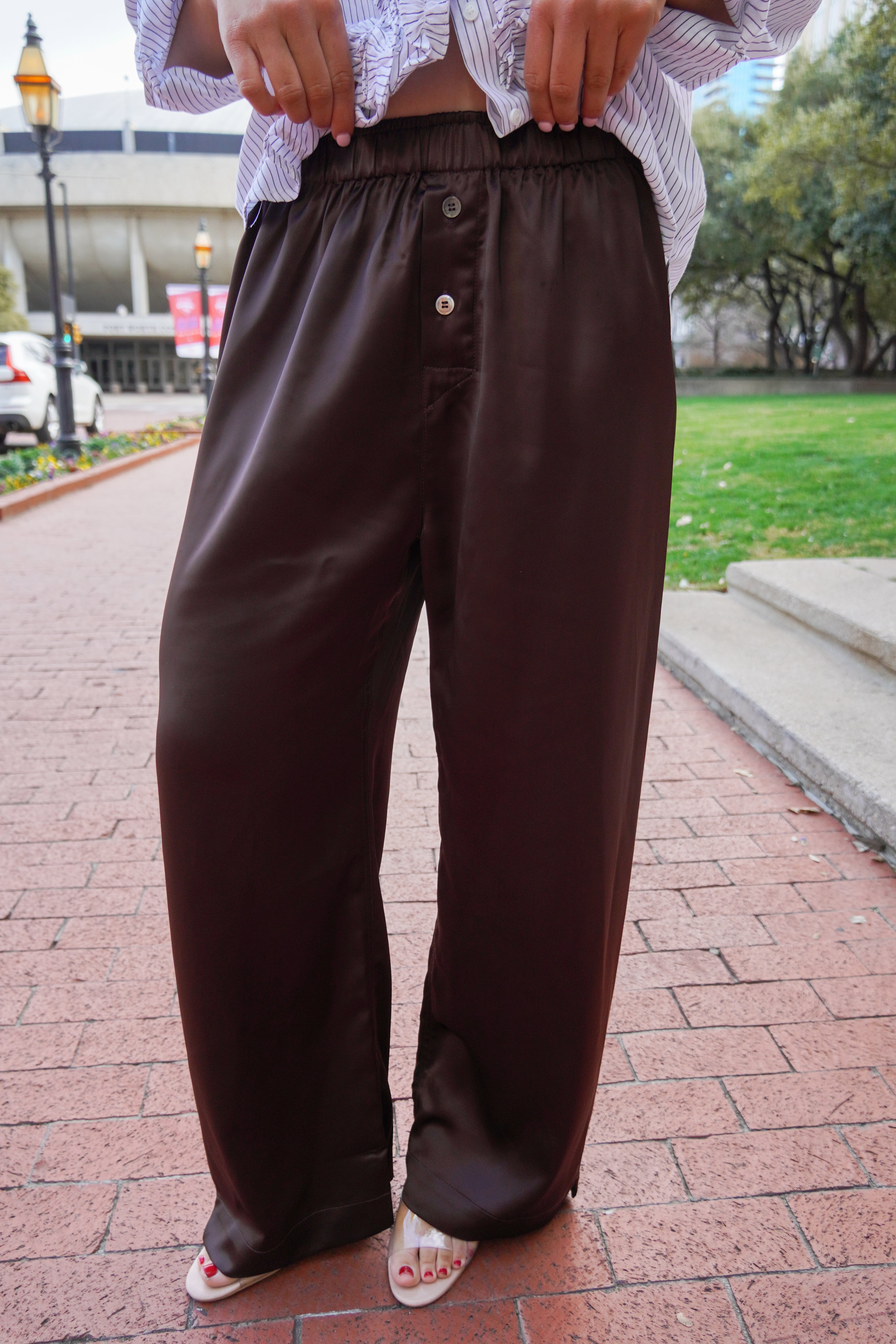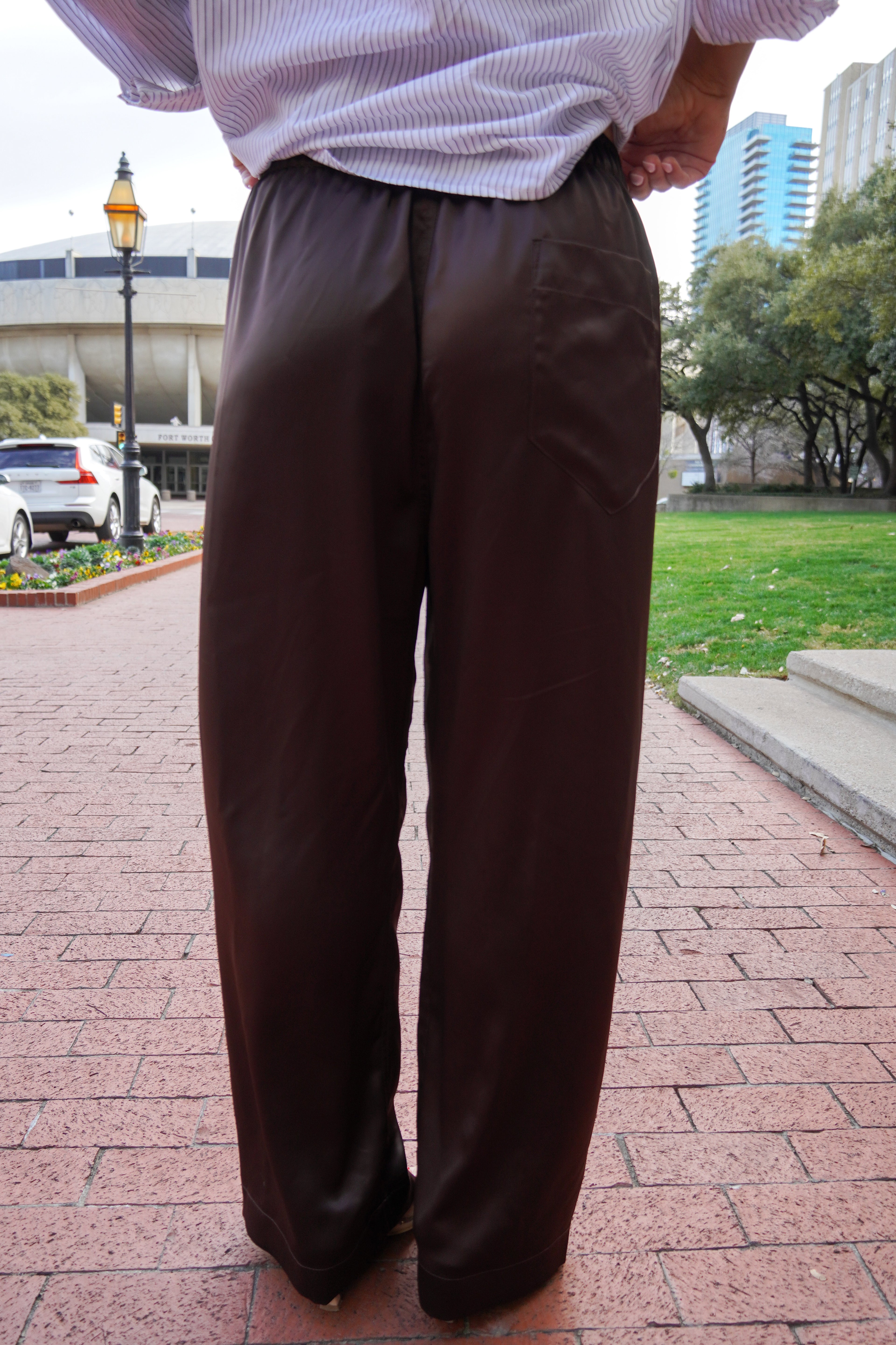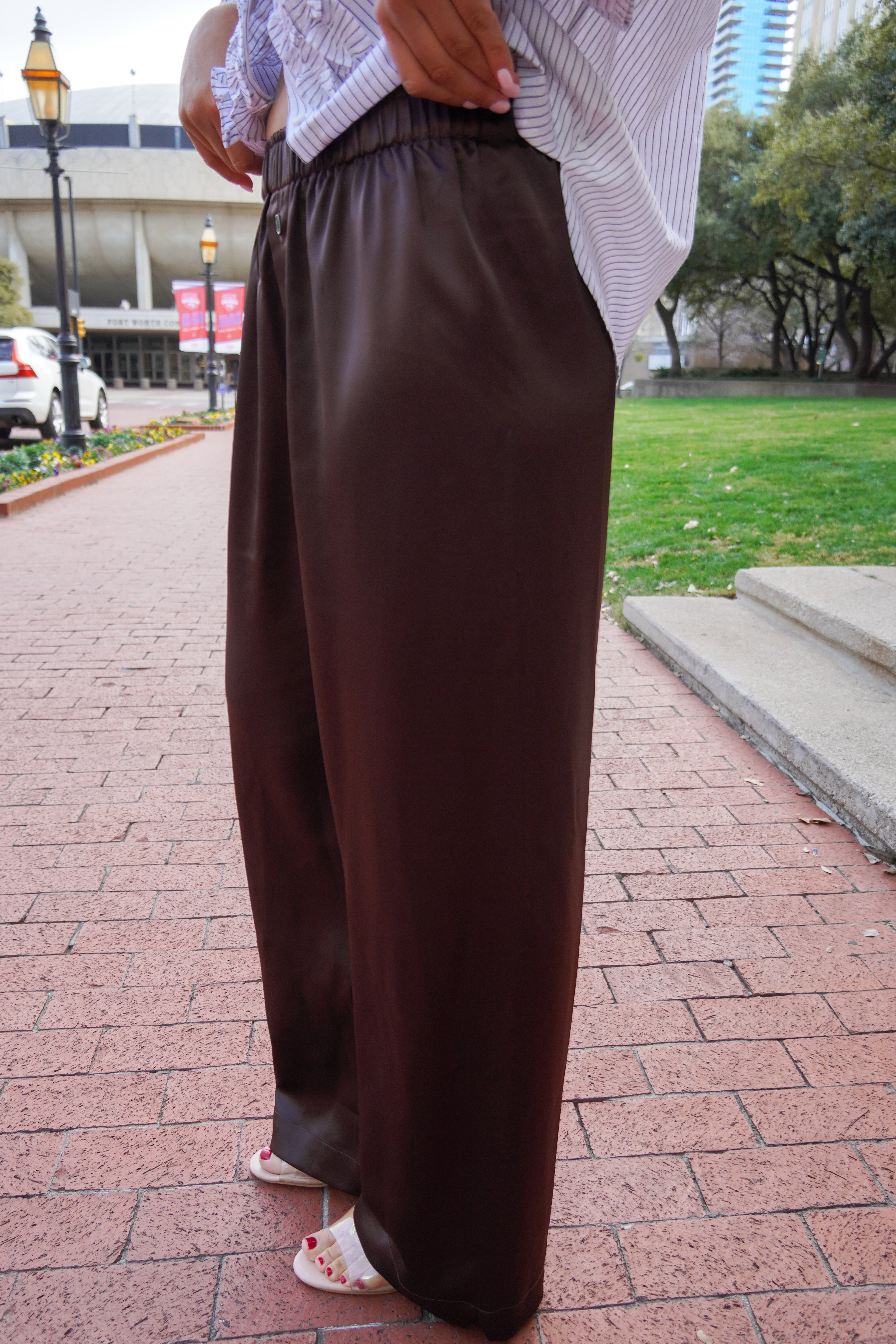 Featuring a rich brown color, these silky pants make for an effortless look-- style them down with sneakers and a cardigan, or dress them up with a blouse and heels-- we are obsessed with the fit and flow of these pants! Ultra comfy, and the most versatile!