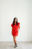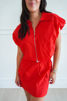 Featuring a true red windbreaker material, a high waisted cargo skirt and capped sleeve zip up jacket, this set is perfect for all of our red colored schools!!!!