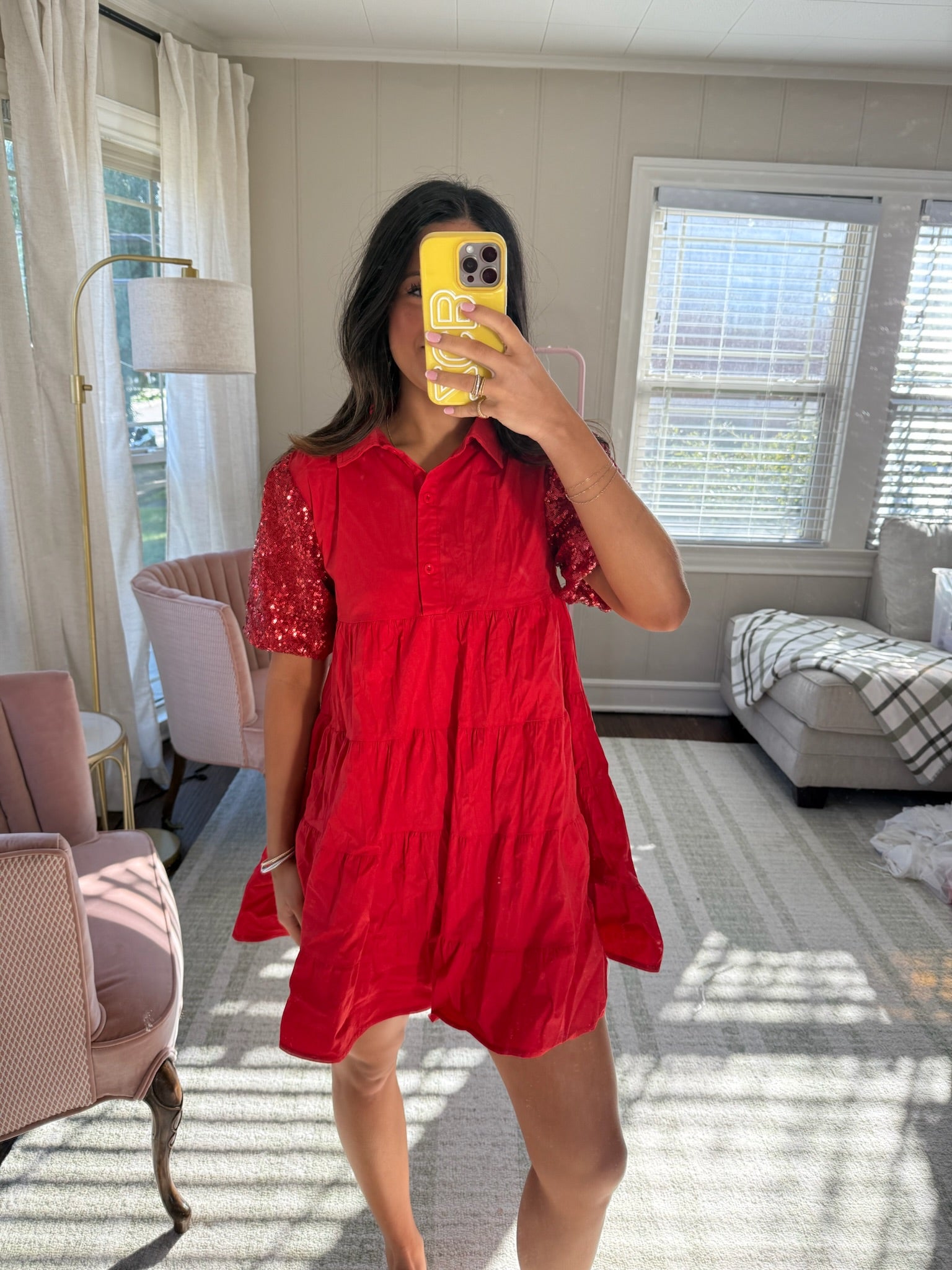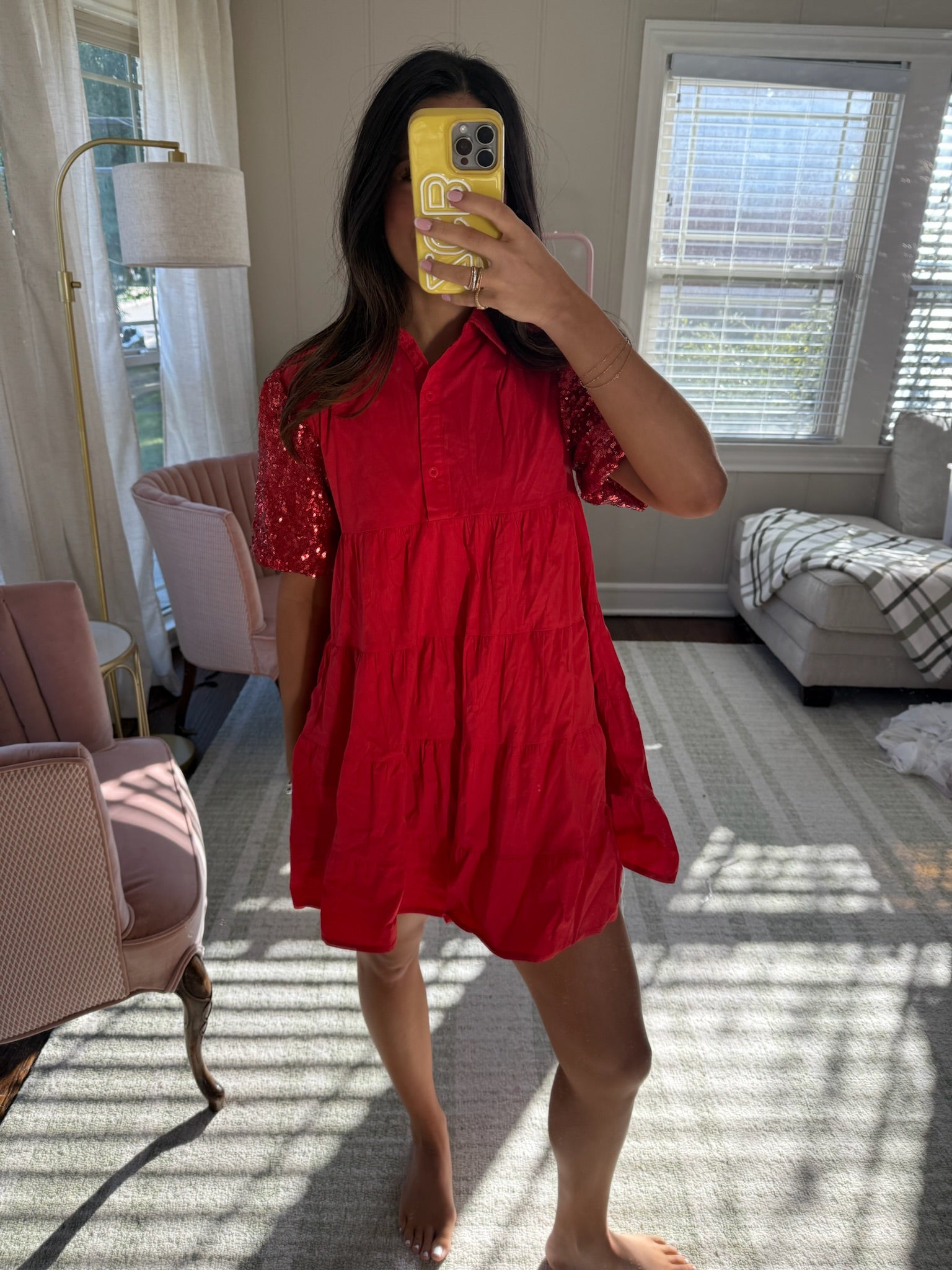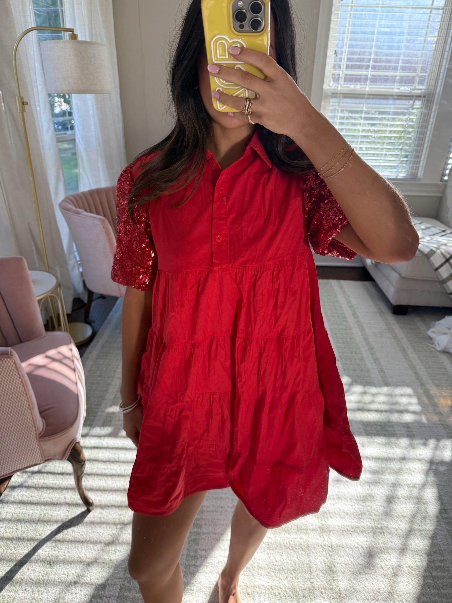 RED MINI DRESS SEQUINED SLEEVES- SMALL
