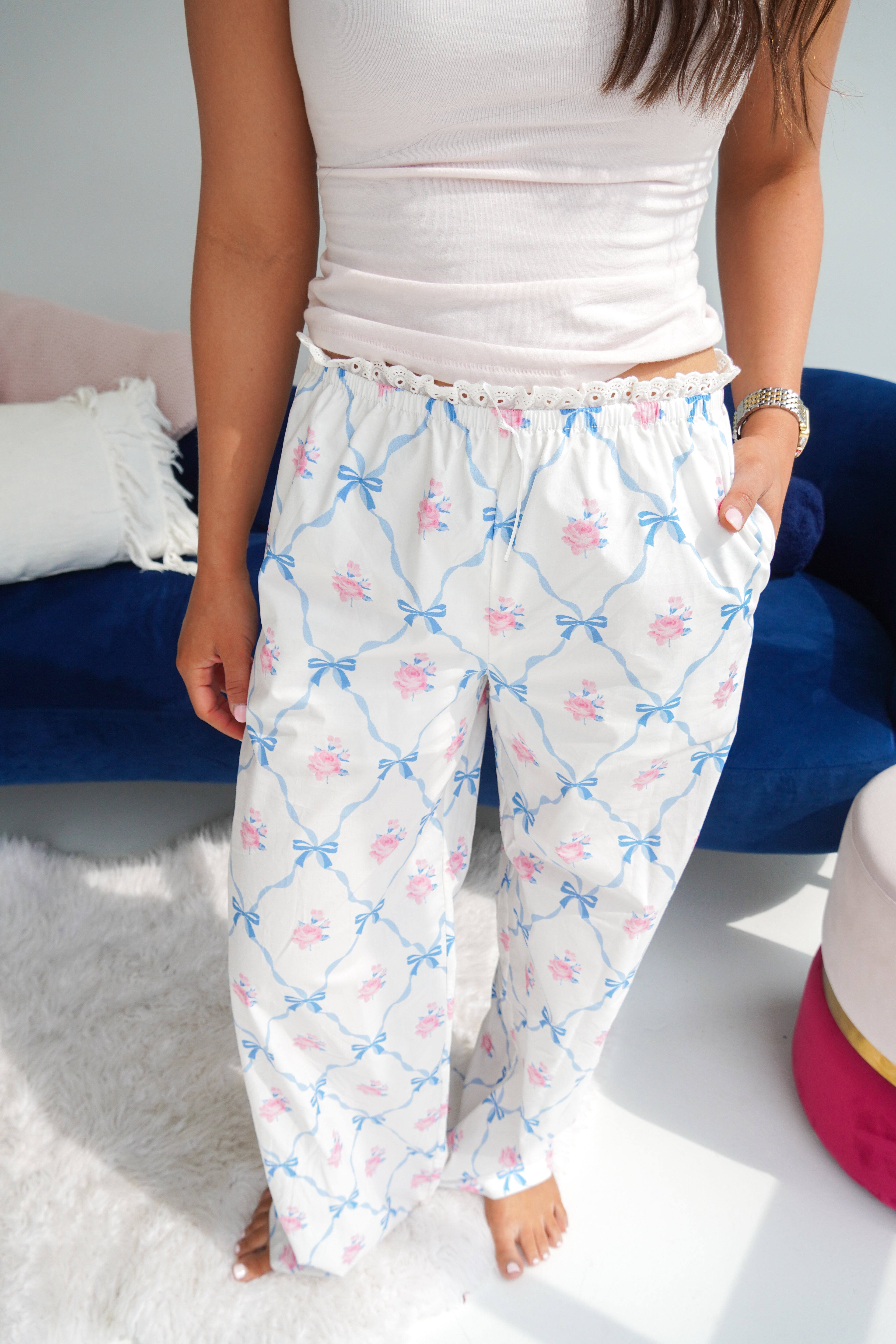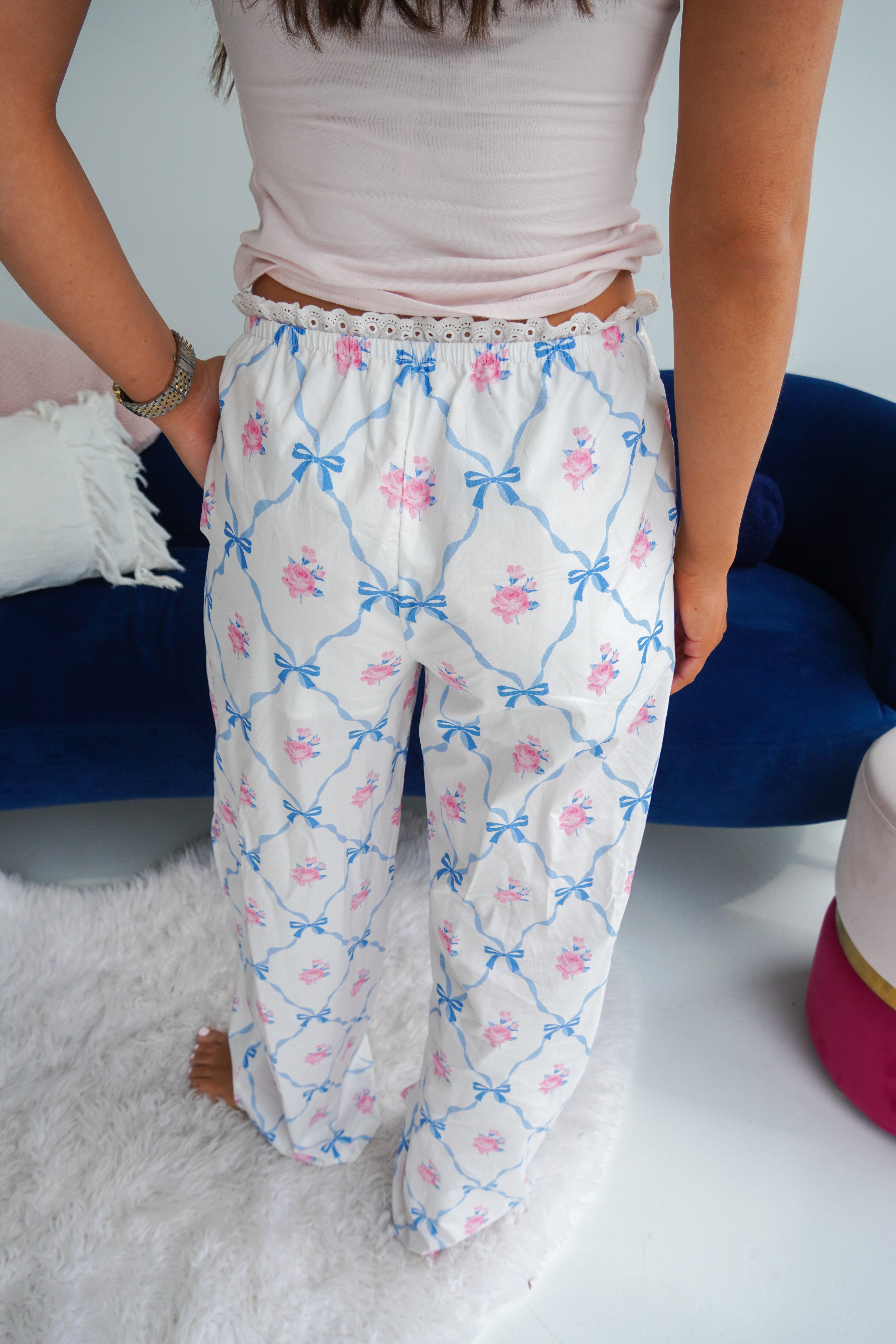 Featuring the cutest white and blue and pink floral print with a lace trim at the waist, these boxer pants are a light cotton perfect for Spring and Summer lounging-- but make it elevated and girly! We are in love!