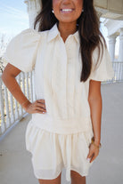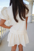 A classic ivory puff sleeve mini dress with buttons along the front, drop waist, a flowy skirt, and a collared neckline-- this dress is perfect for Easter, the bride-to-be, a girls day, or going to Masters! A classic fit and style for your closet year around!