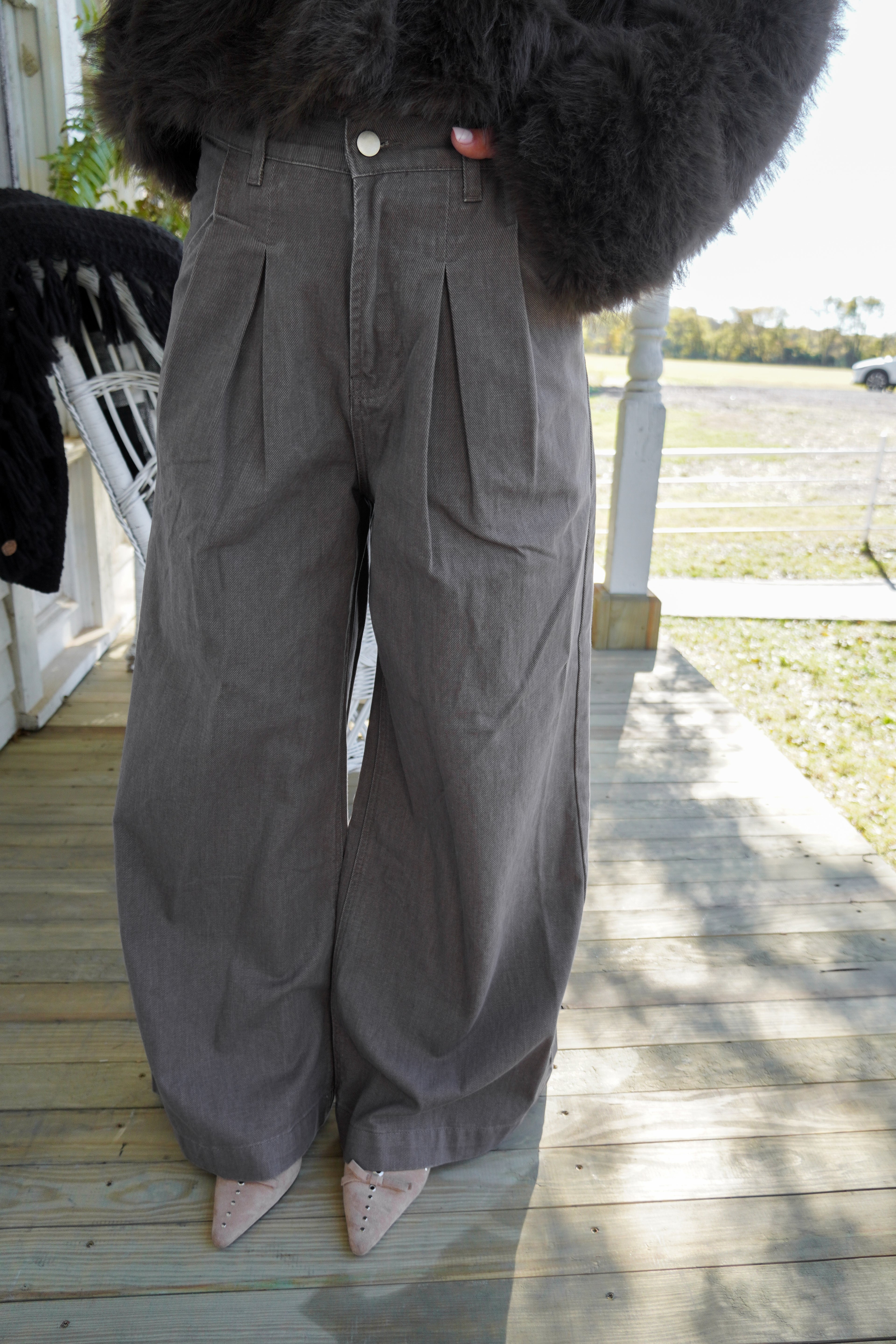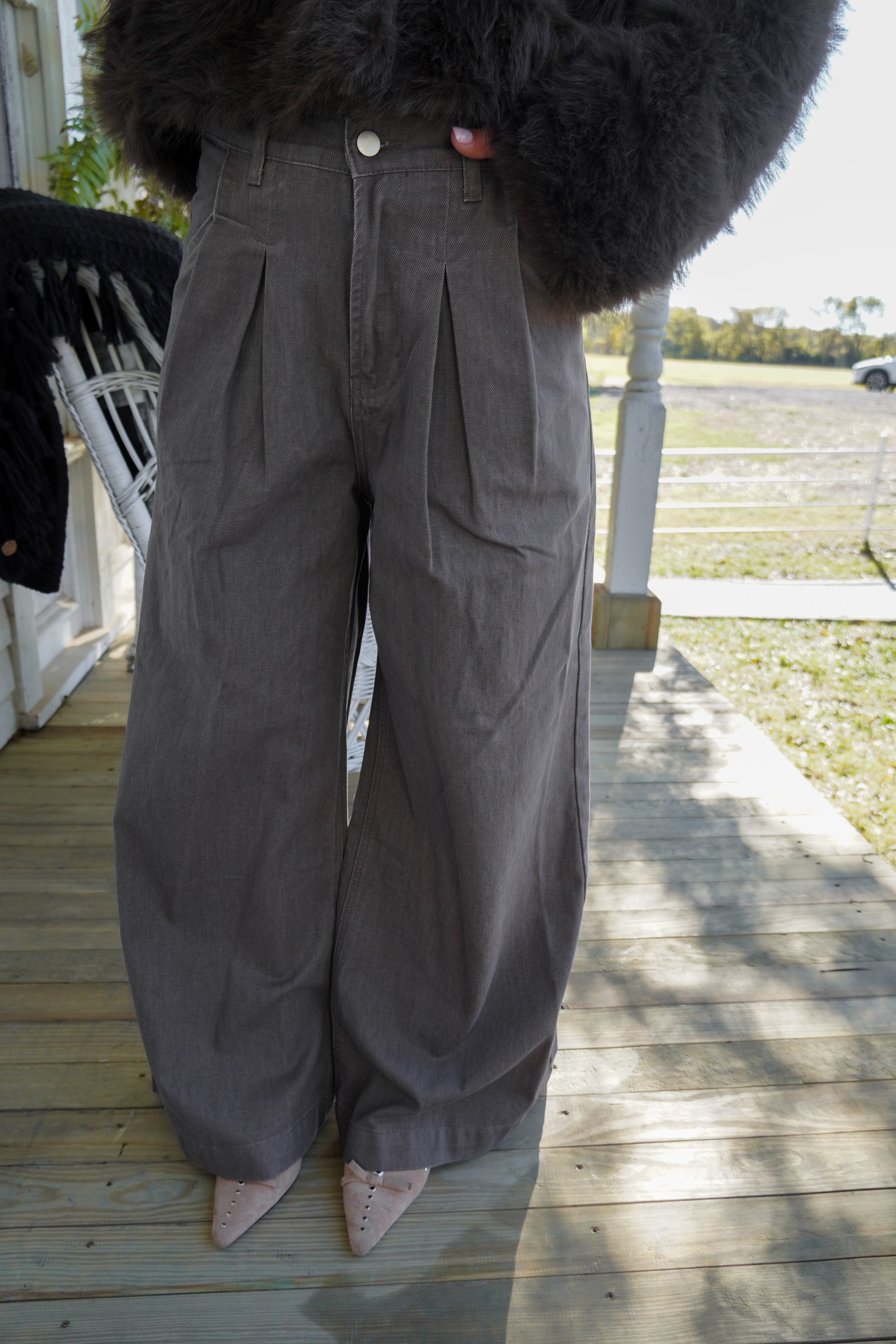 These jeans are your new Fall staple!! We love the wide leg fit, the pleats & light brown/gray denim.