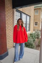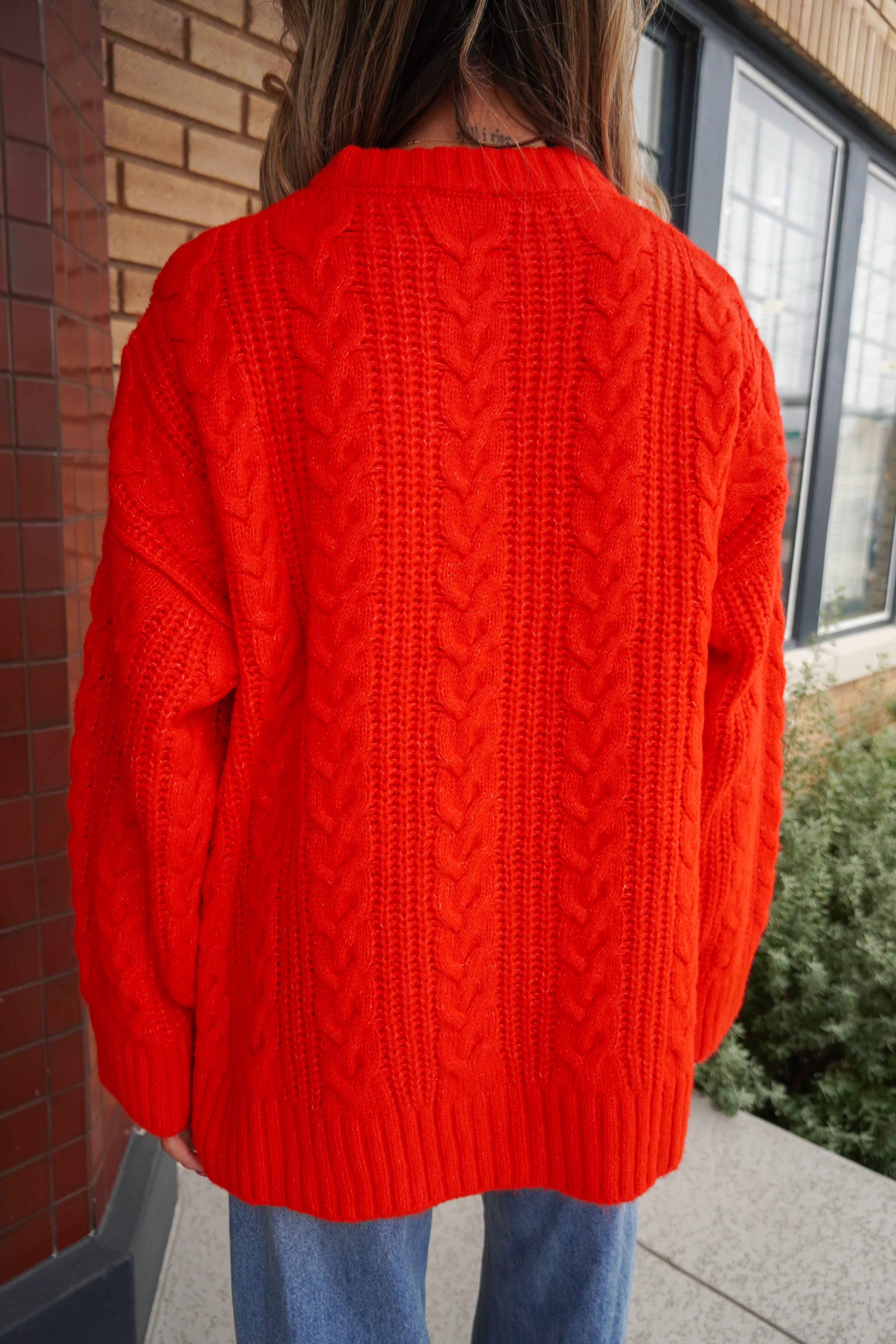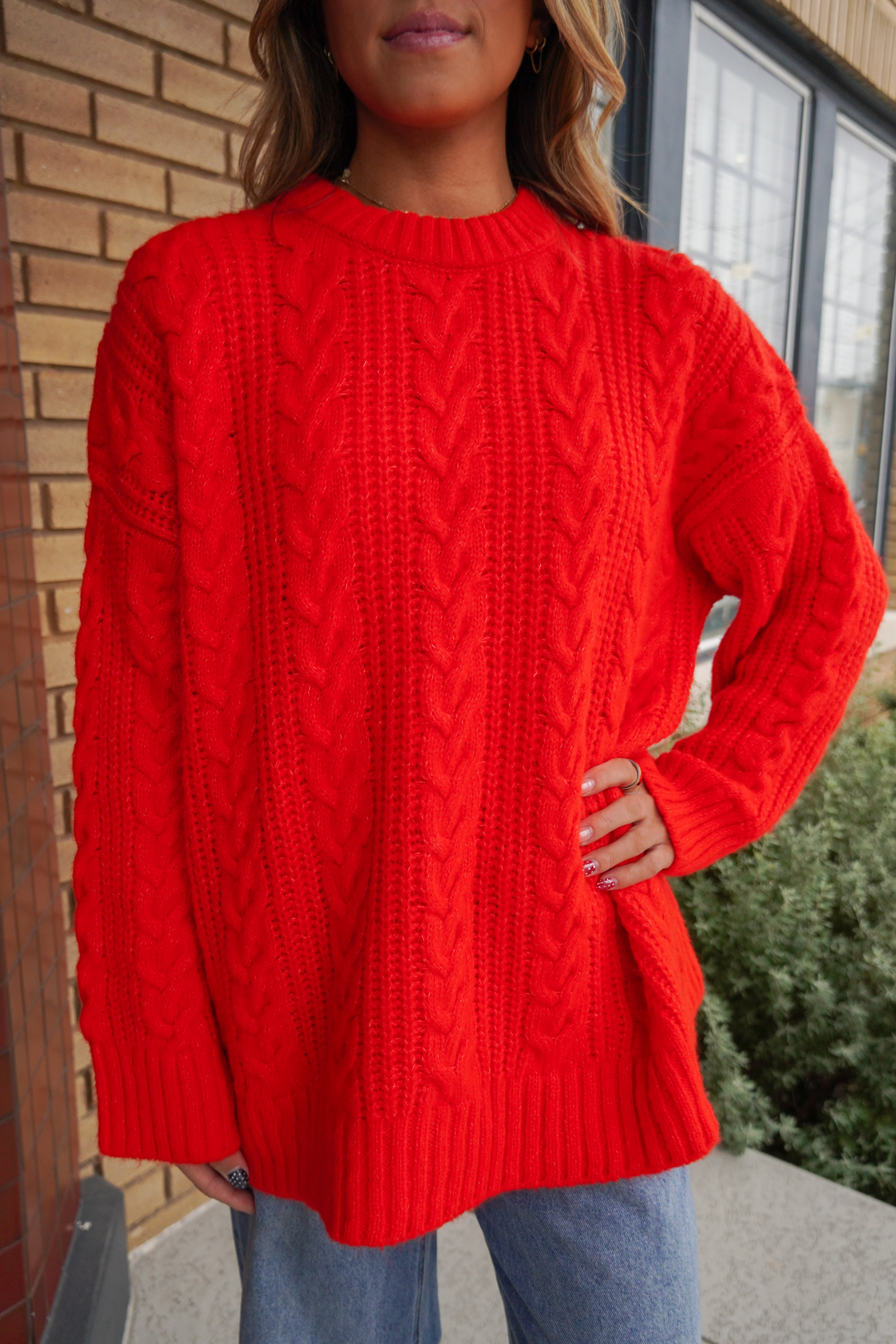 Featuring a true red color, a chunky cable knit, and the perfect oversized fit-- this sweater is such a fun pop of color and so cozy--you will never want to take it off!!