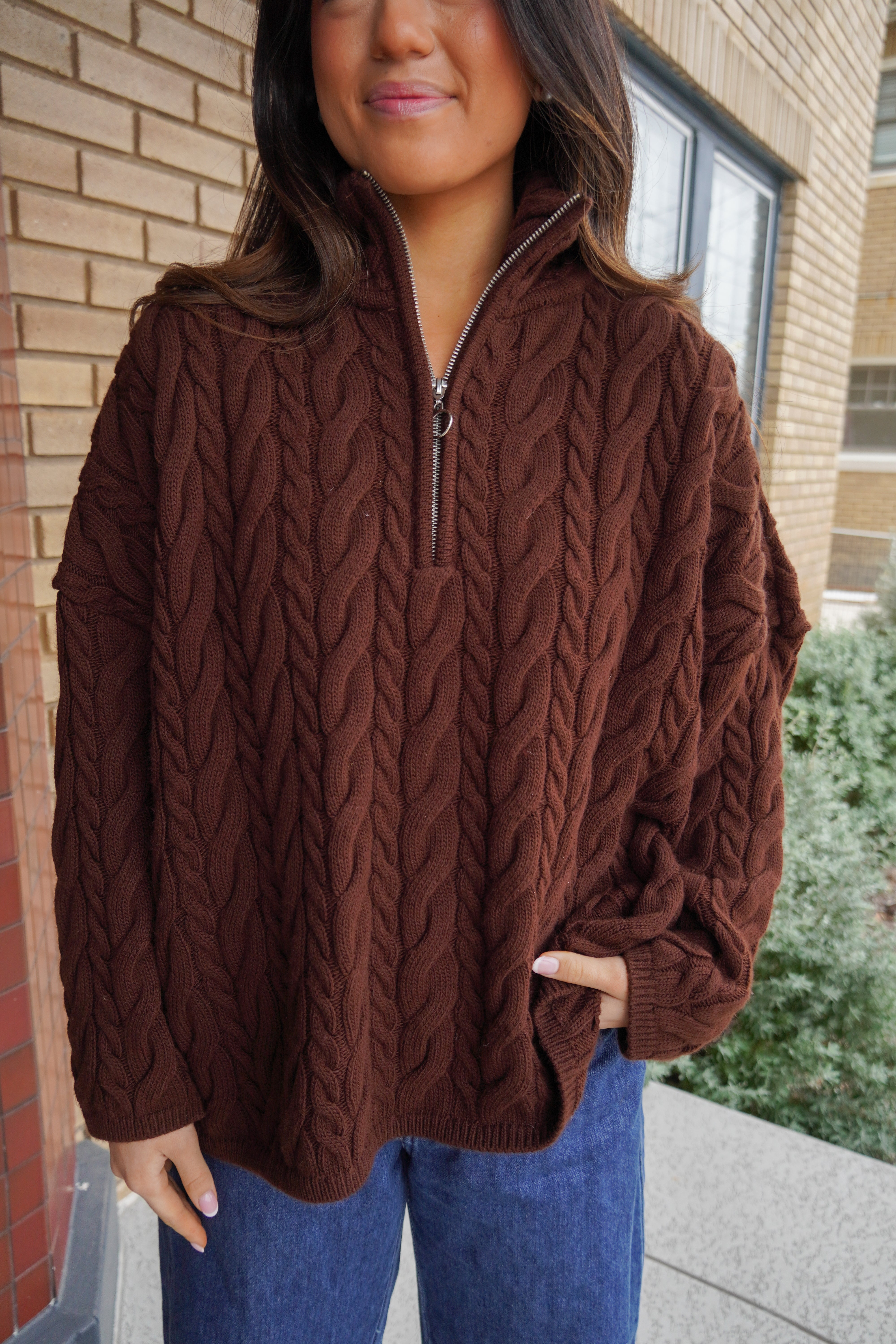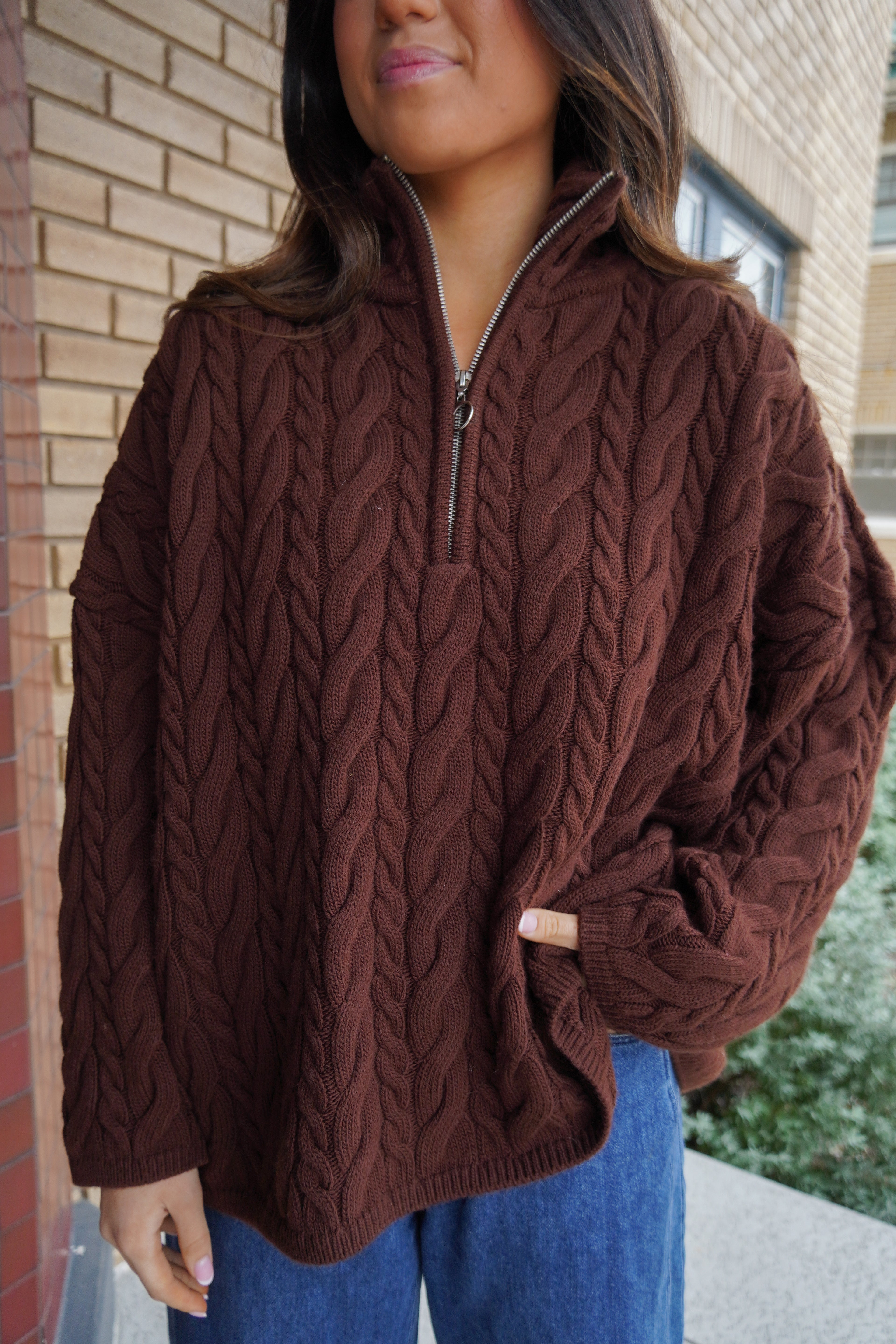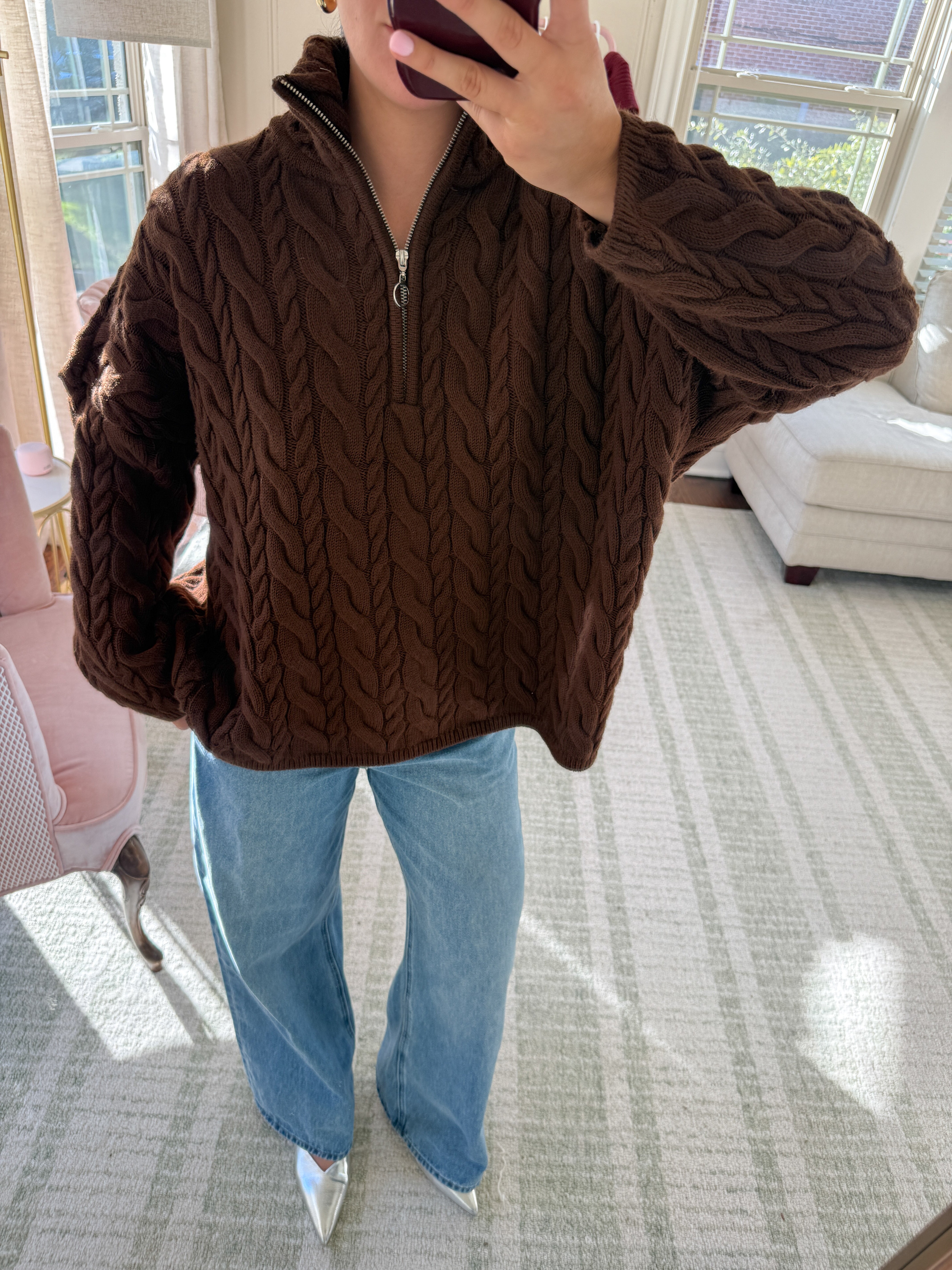 Featuring a rich brown, a quarter zip + a thick cable knit sweater-- we are OBSESSED with the oversized and comfy fit of this sweater.
