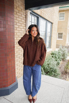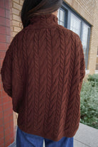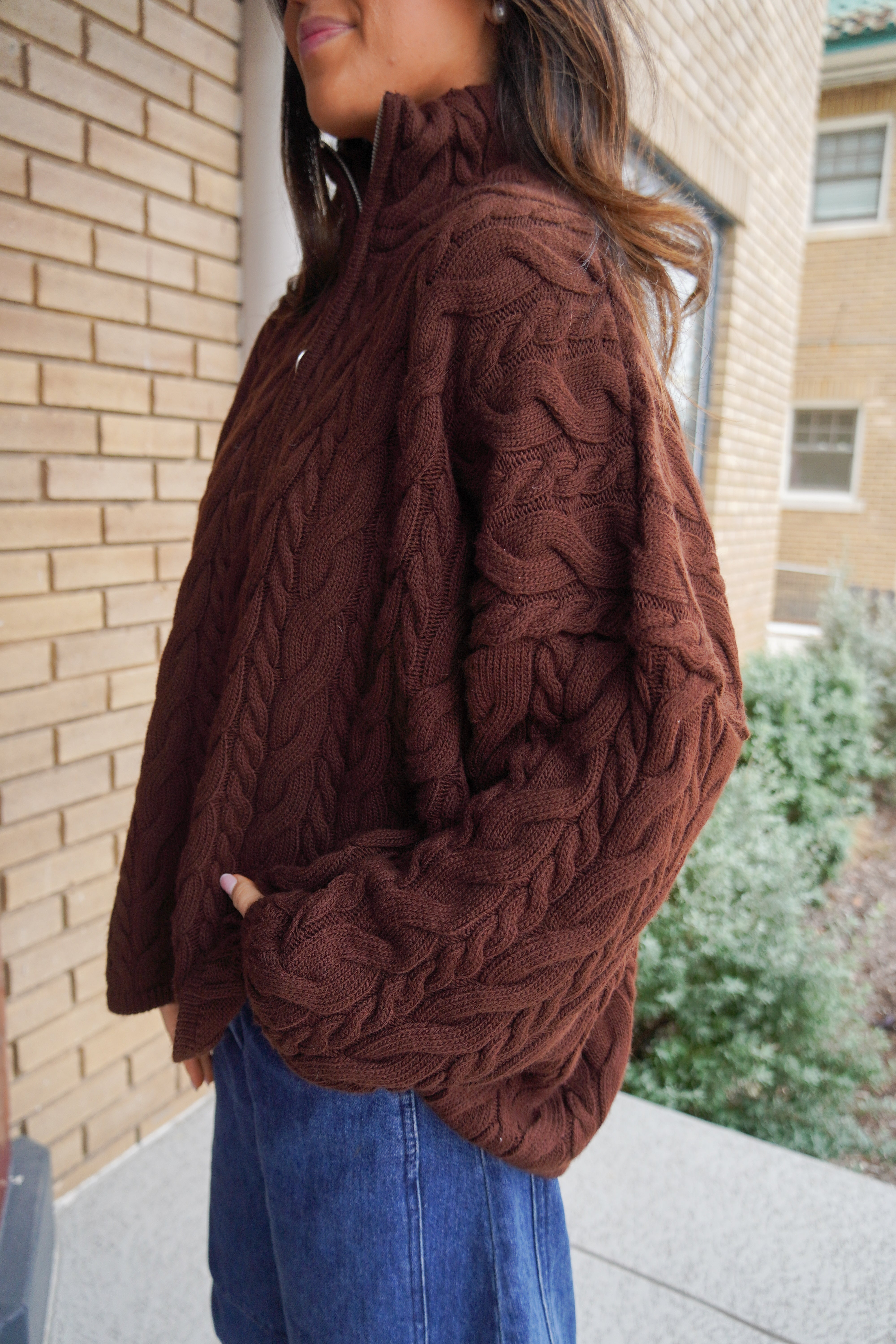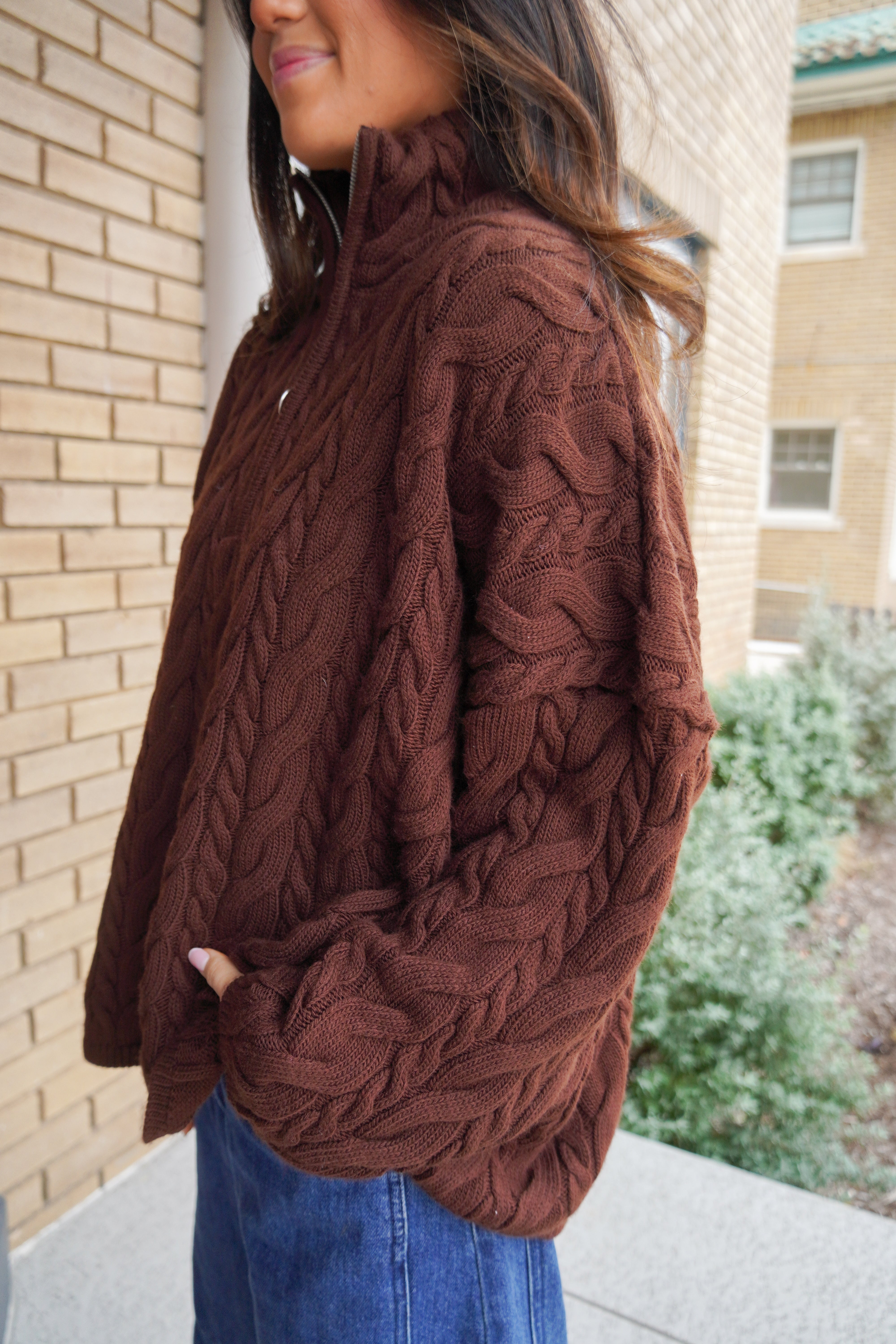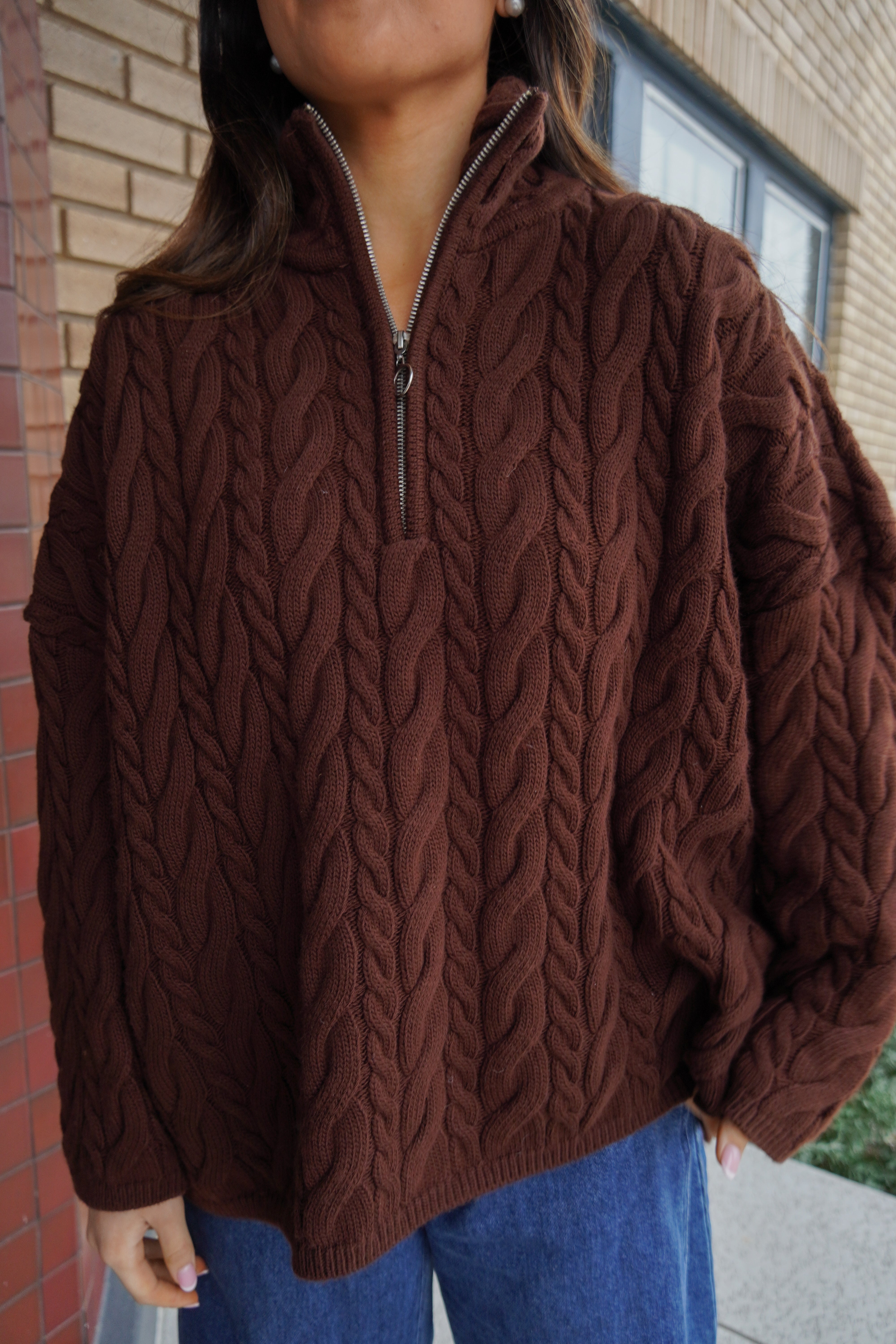 Featuring a rich brown, a quarter zip + a thick cable knit sweater-- we are OBSESSED with the oversized and comfy fit of this sweater.