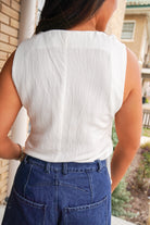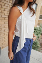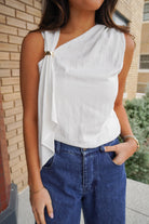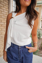 Featuring an asymmetrical neckline and a fun on shoulder gold accent detail-- we love this top for year around styling.