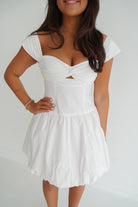 Featuring wide cap-like straps, a bubble skirt and a drop waist, this mini dress is a classic and ideal for the bride-to-be or graduating girlies!