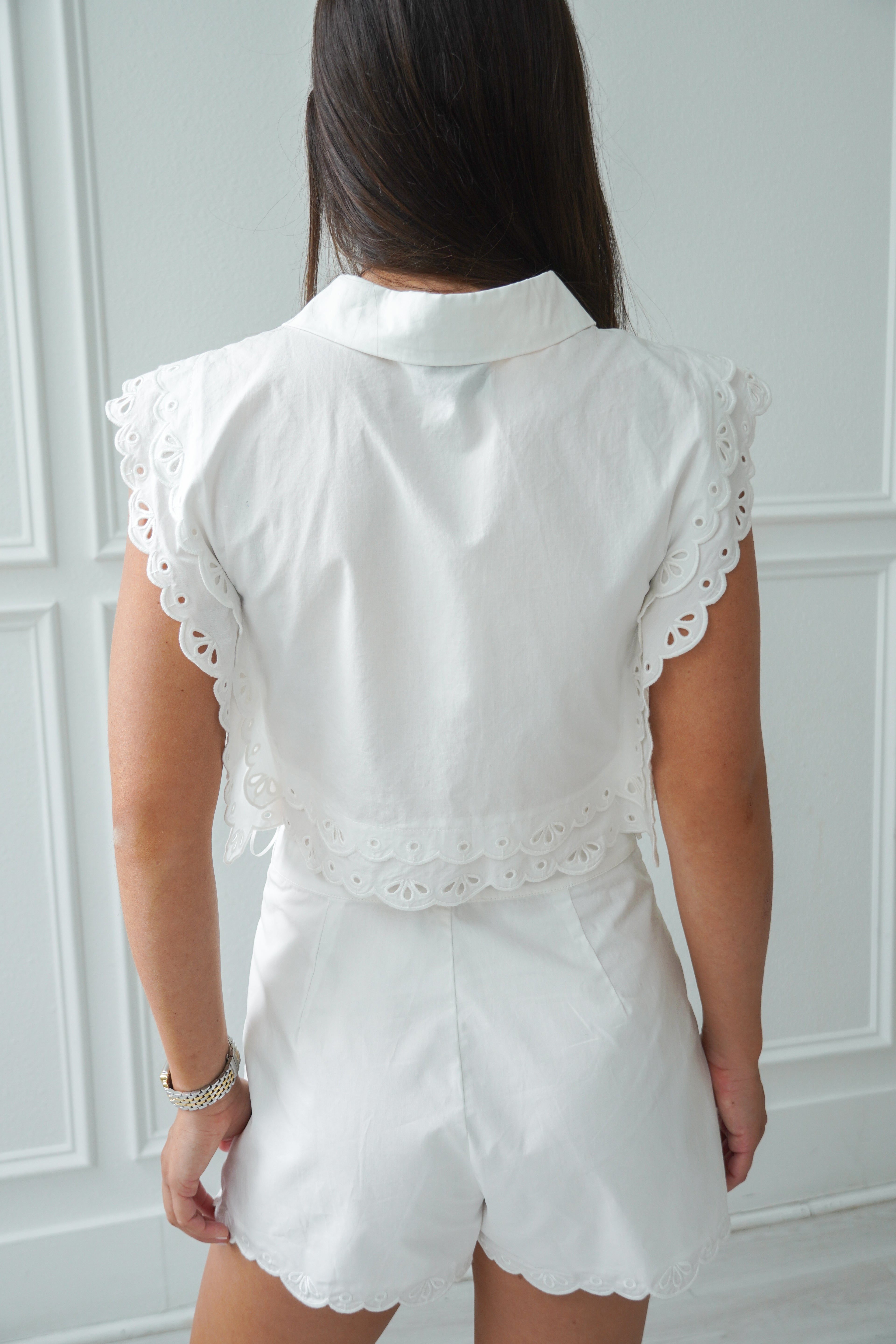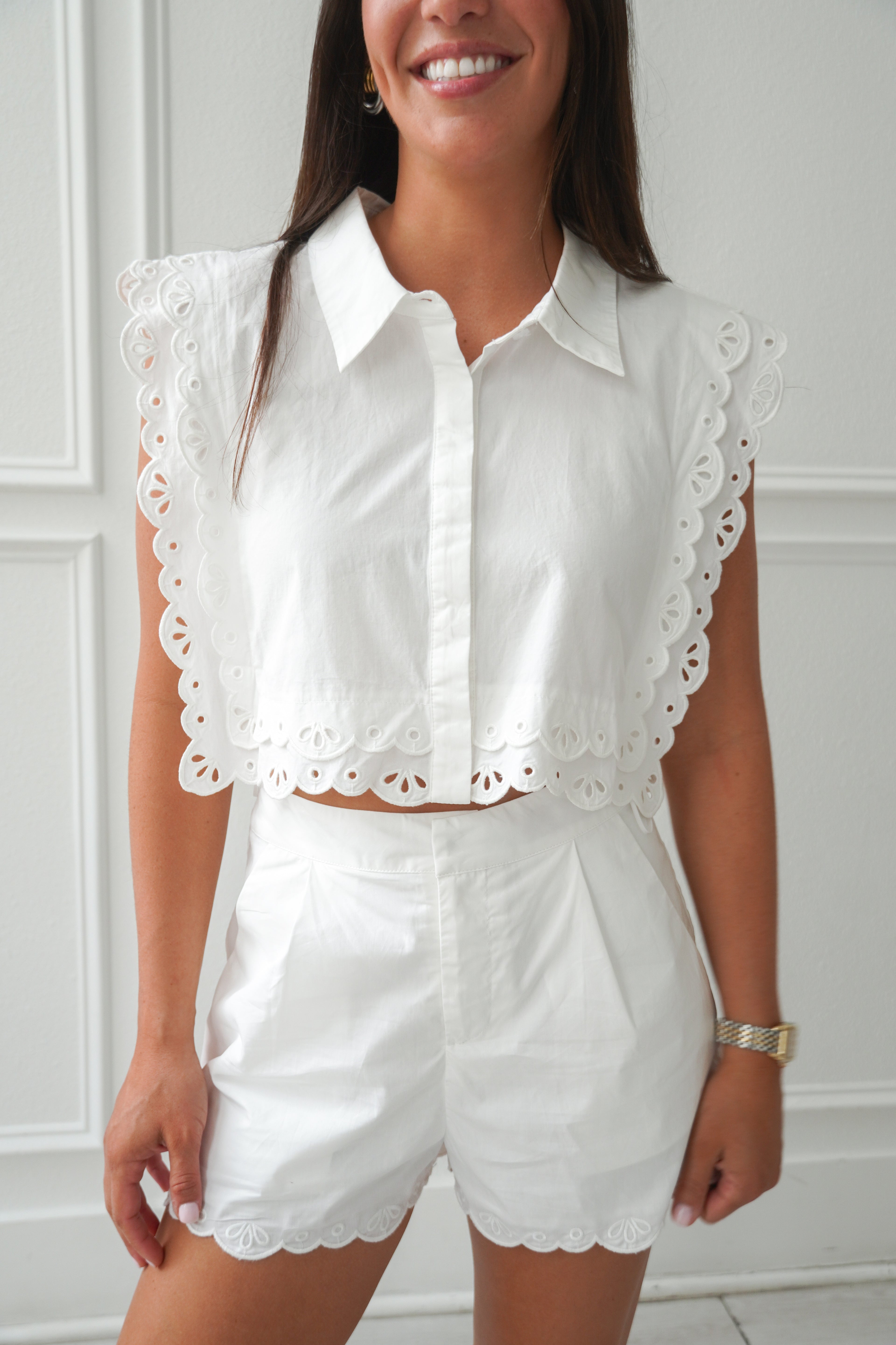 Featuring eyelet trim detailing, a cropped boxy top and high waisted shorts, this set is the perfect Summer set or for the bride-to-be!