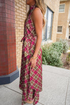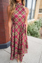 Featuring a gorgeous plaid print, a tie at the waist, a halter neckline,and a fun asymmetrical hem-- this dress is perfect for the holidays.