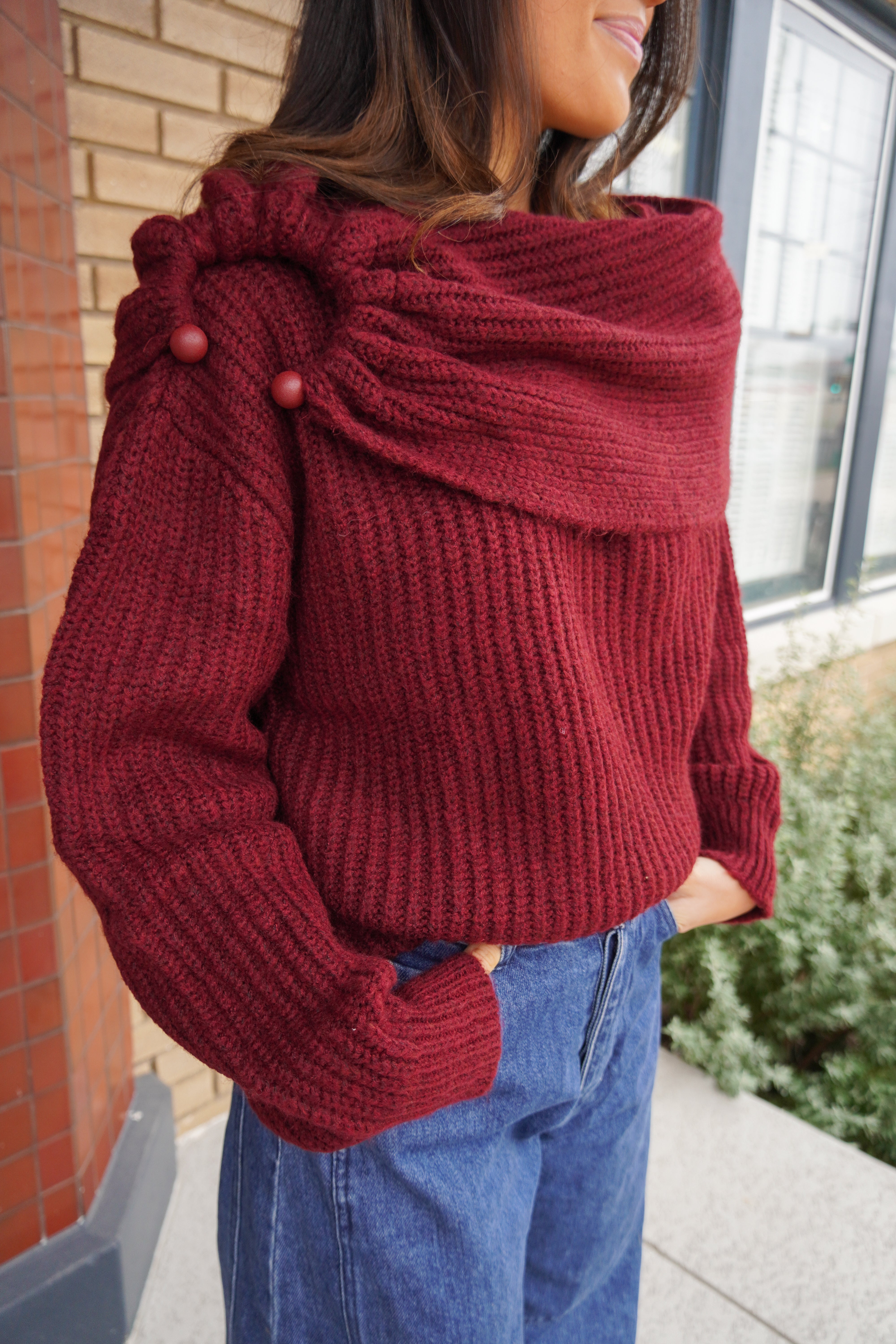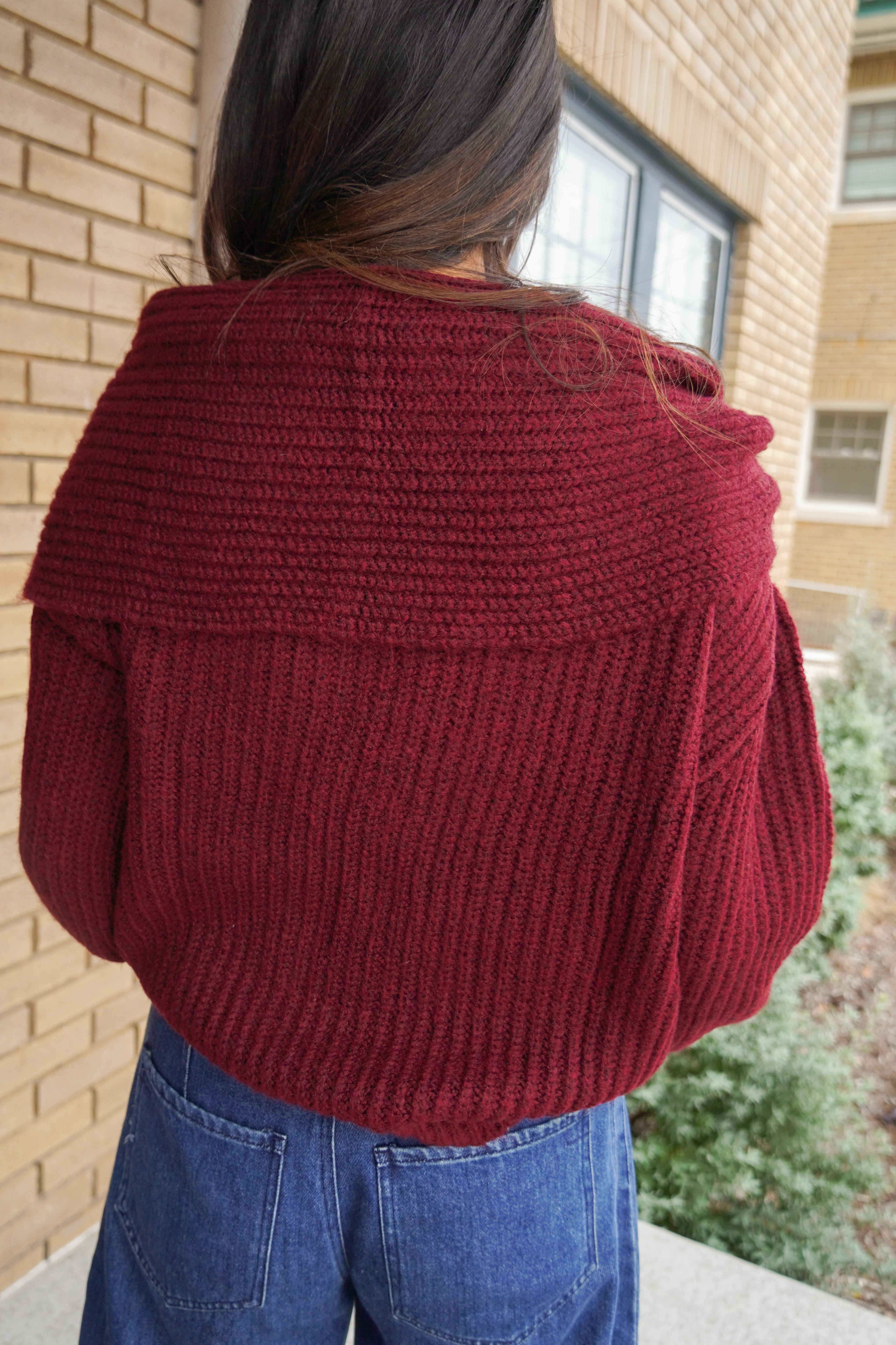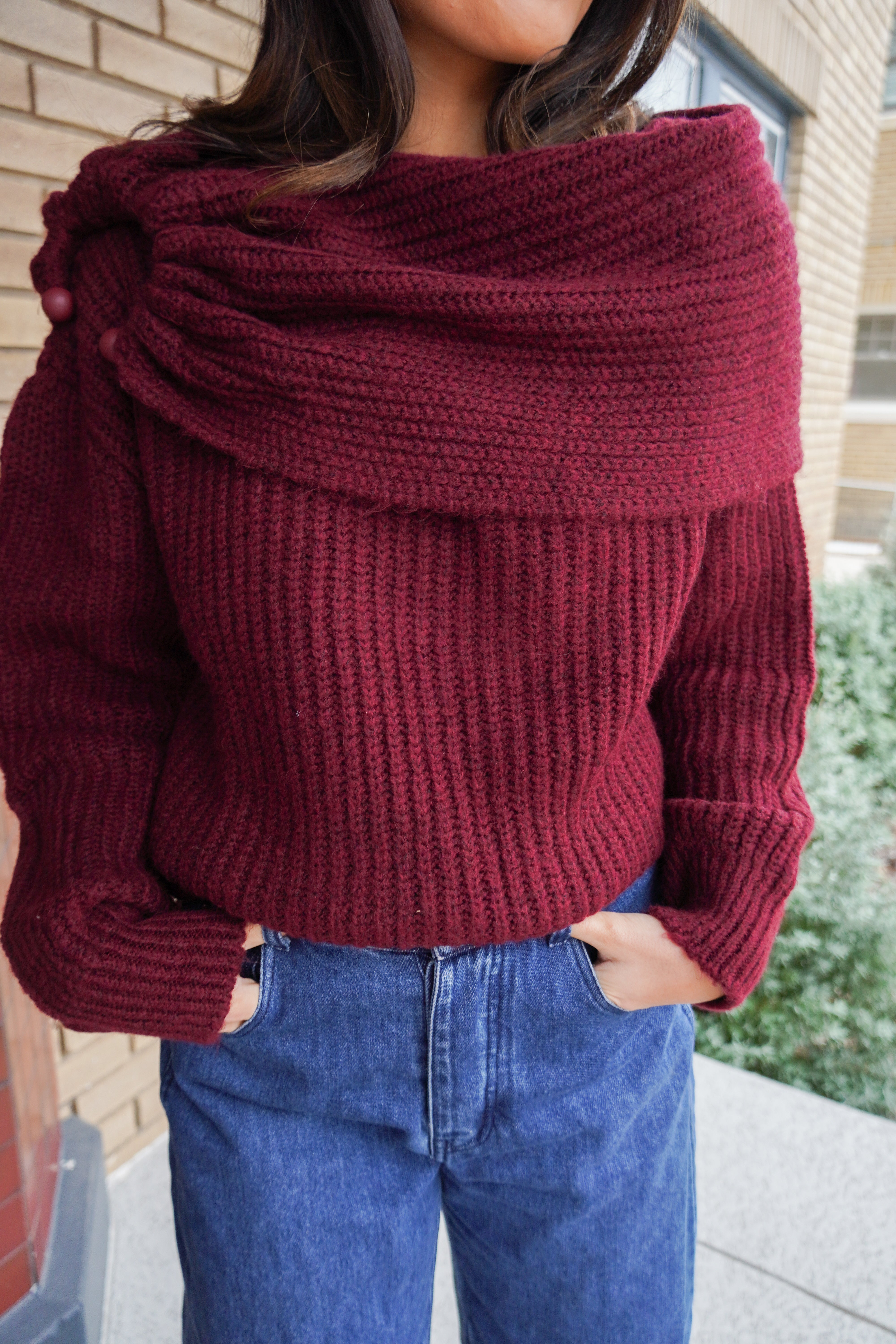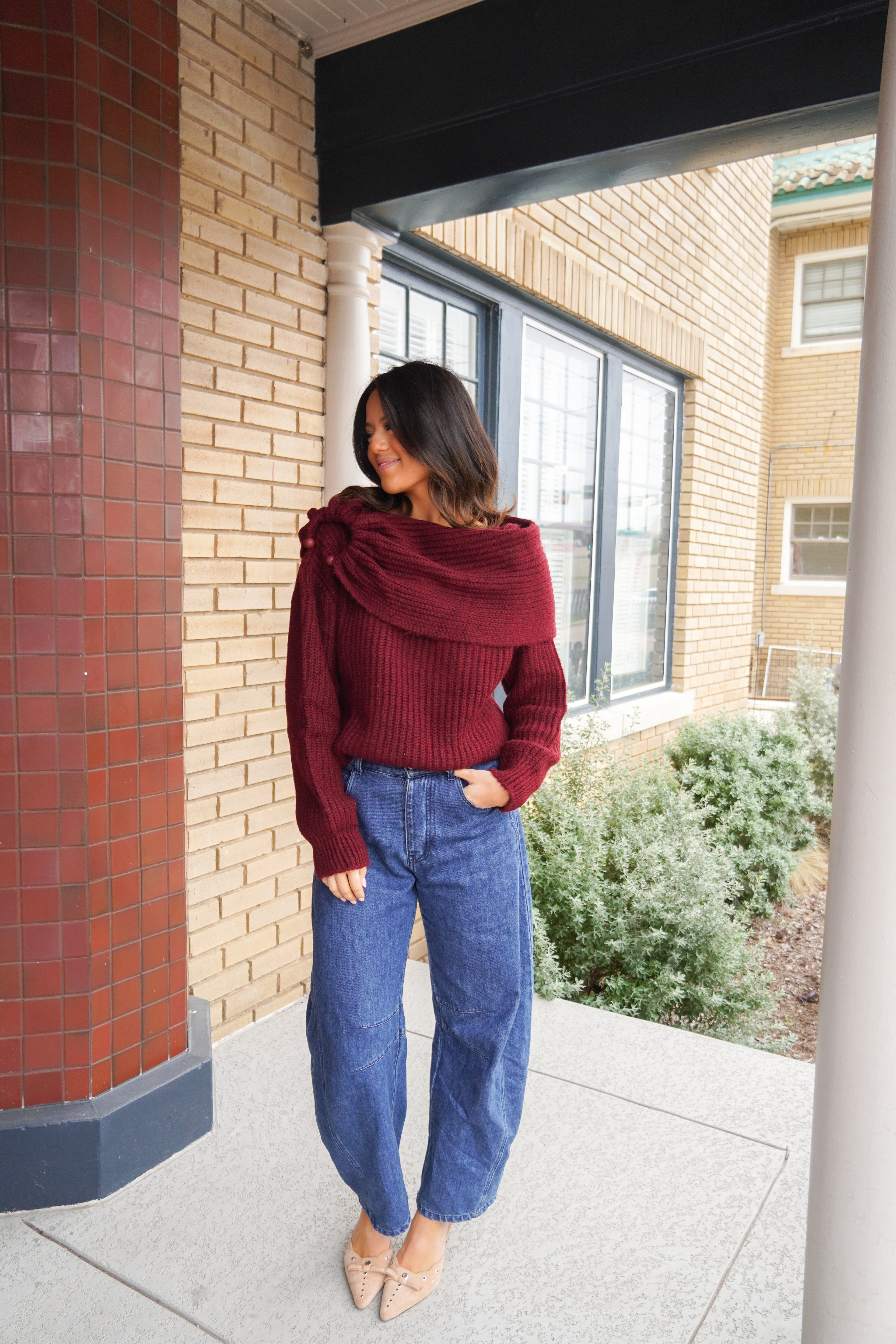 Featuring an off the shoulder folded neckline, this burgundy knit sweater is so cozy + chic for this Winter! Styles so easy with jeans or your favorite skirt!