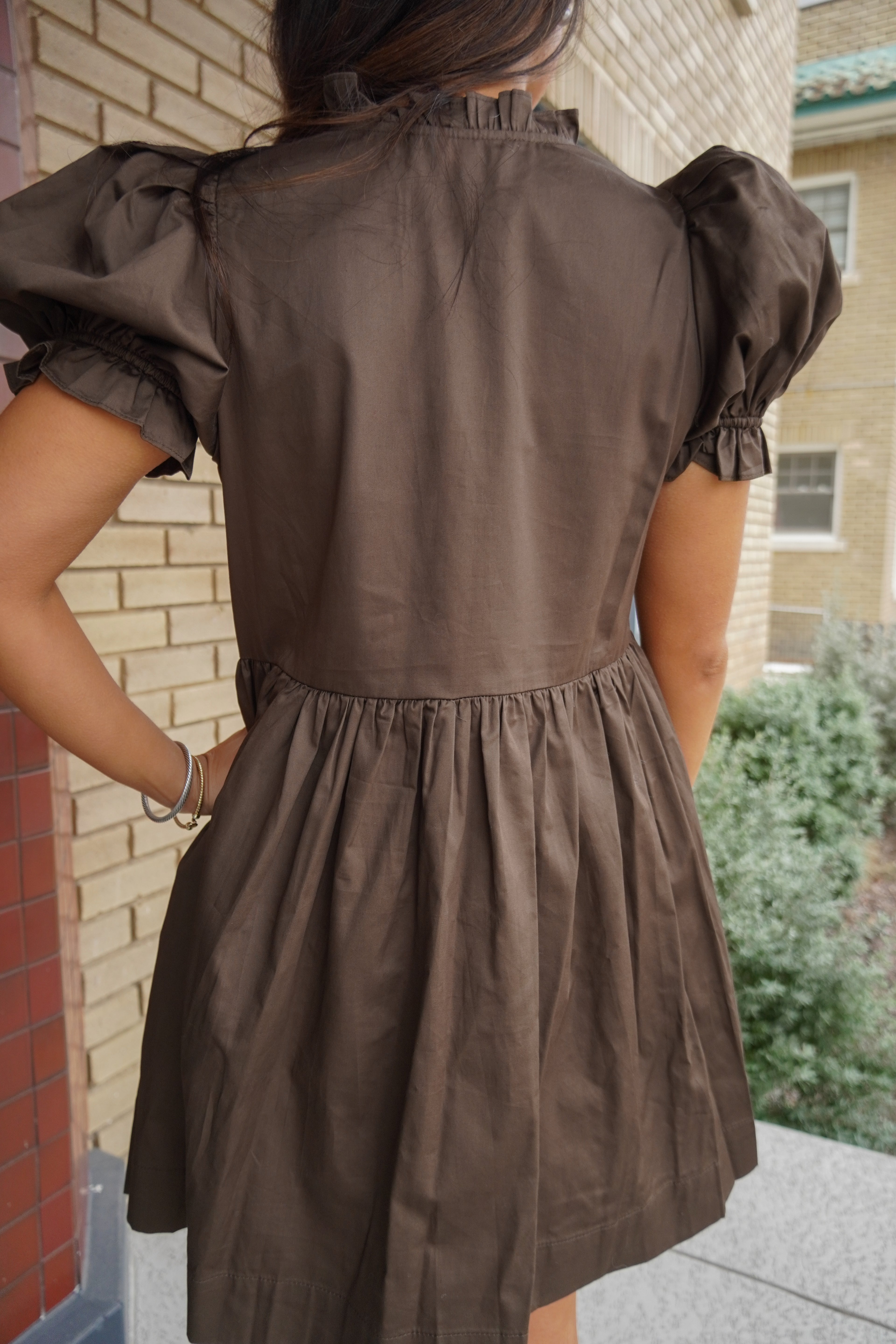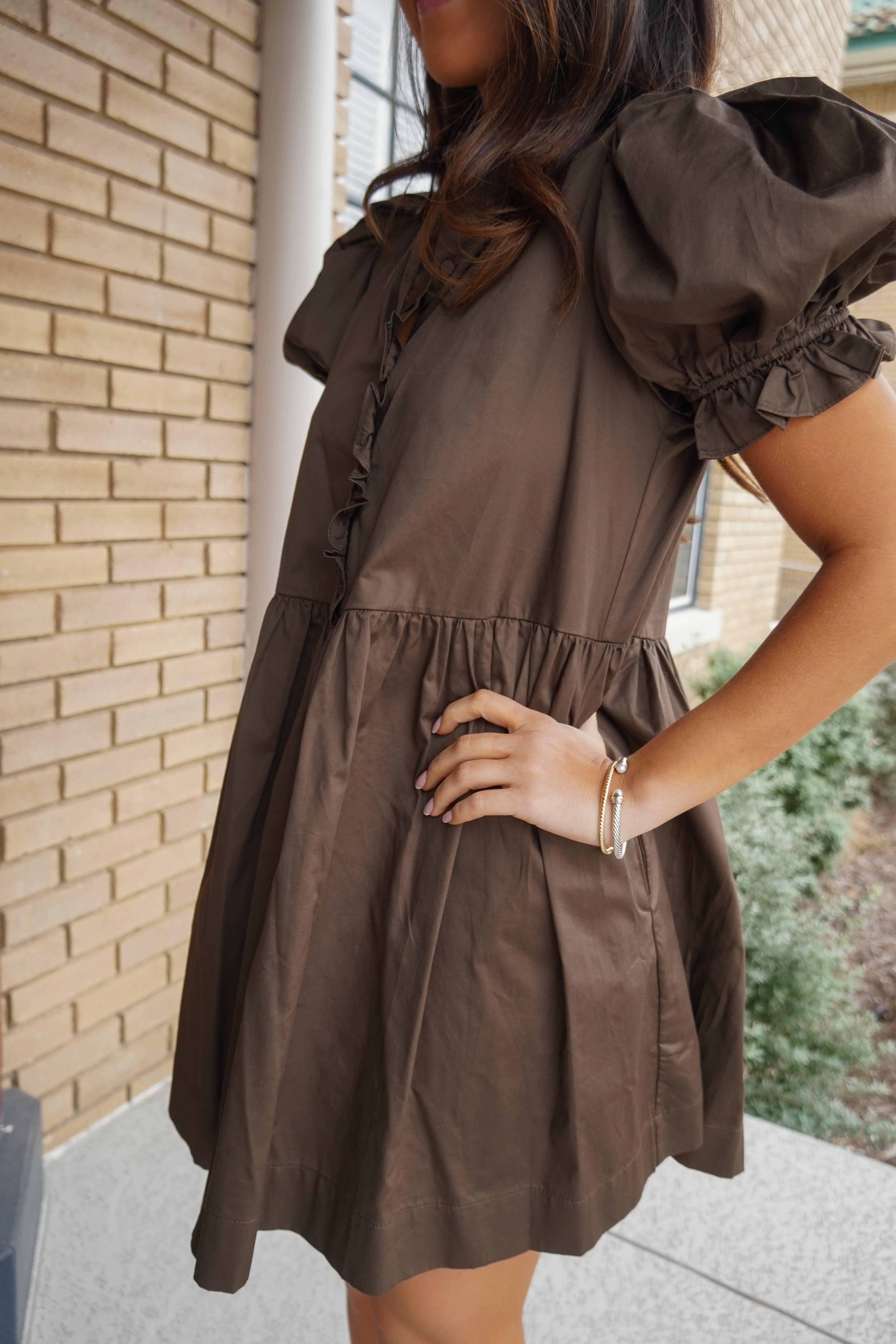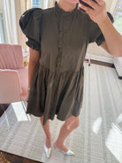 Featuring a true olive green color, bubble sleeves, and ruffled trim along the hem-- this dress is classy + the perfect date night or night out dress!