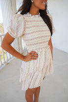 This cream and light pink floral smocked mini dress is perfect for all Spring and Summer long!! With bubble sleeves and a light and airy fabric-- it's easy to wear styled up or down and is a must-have this season!!