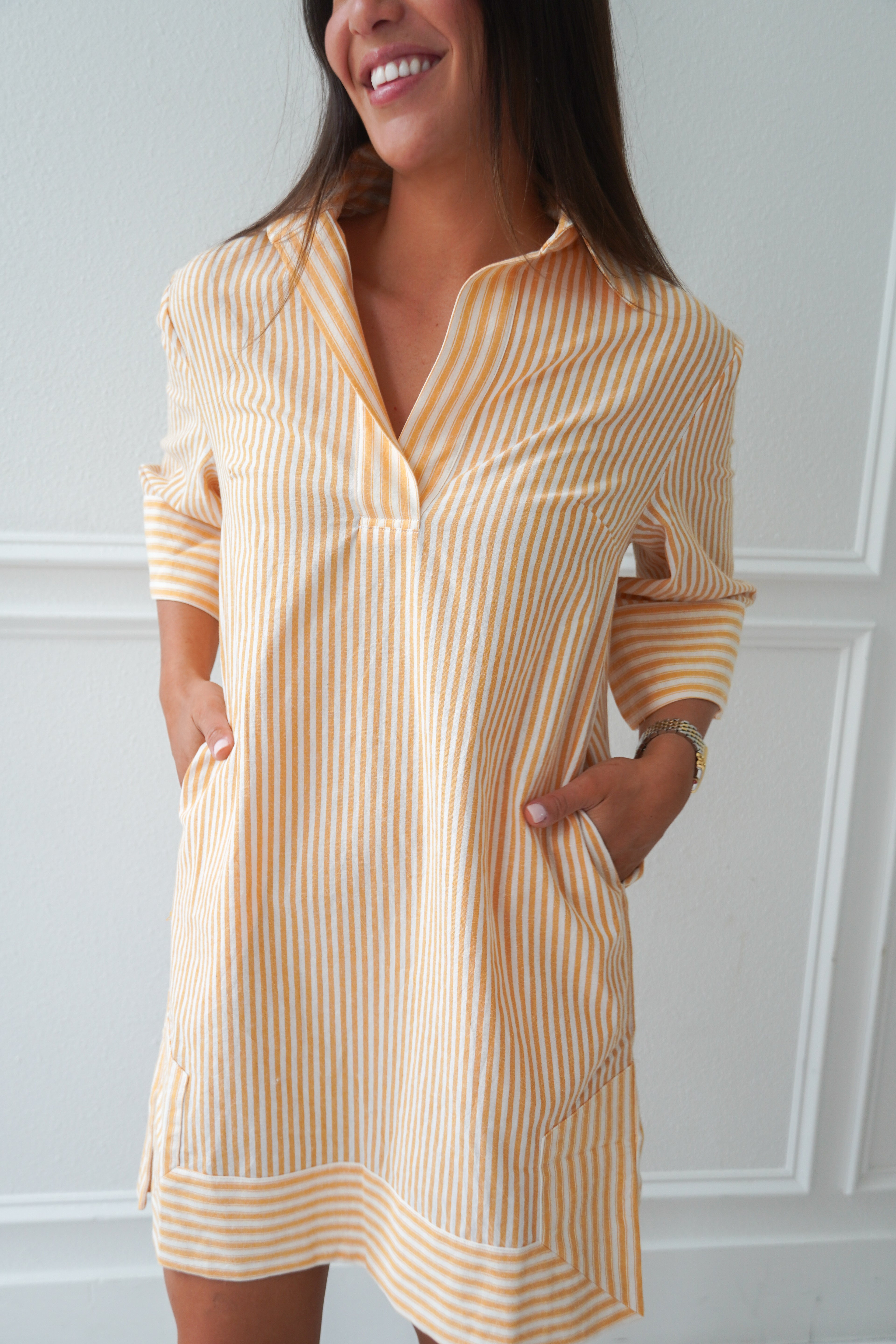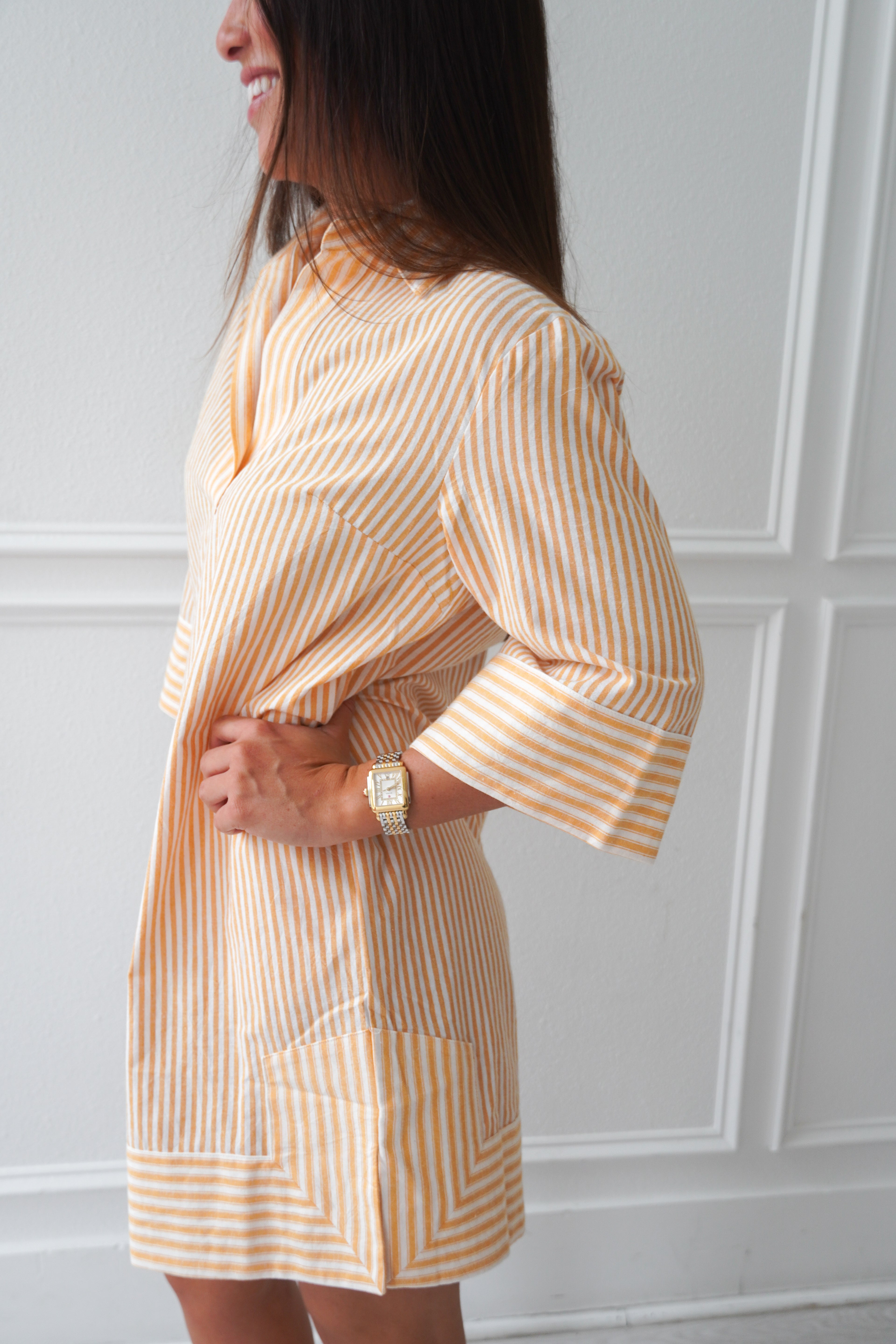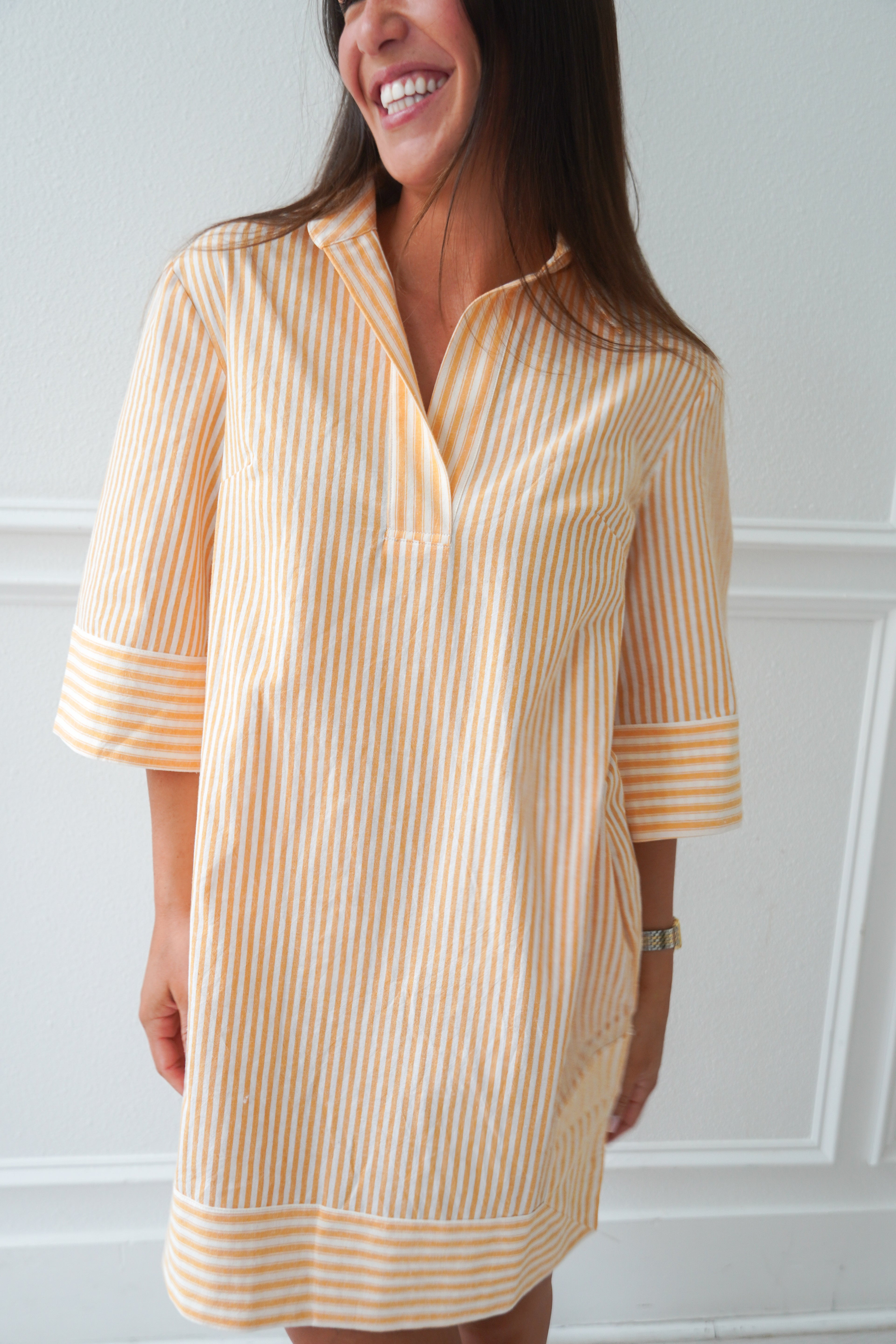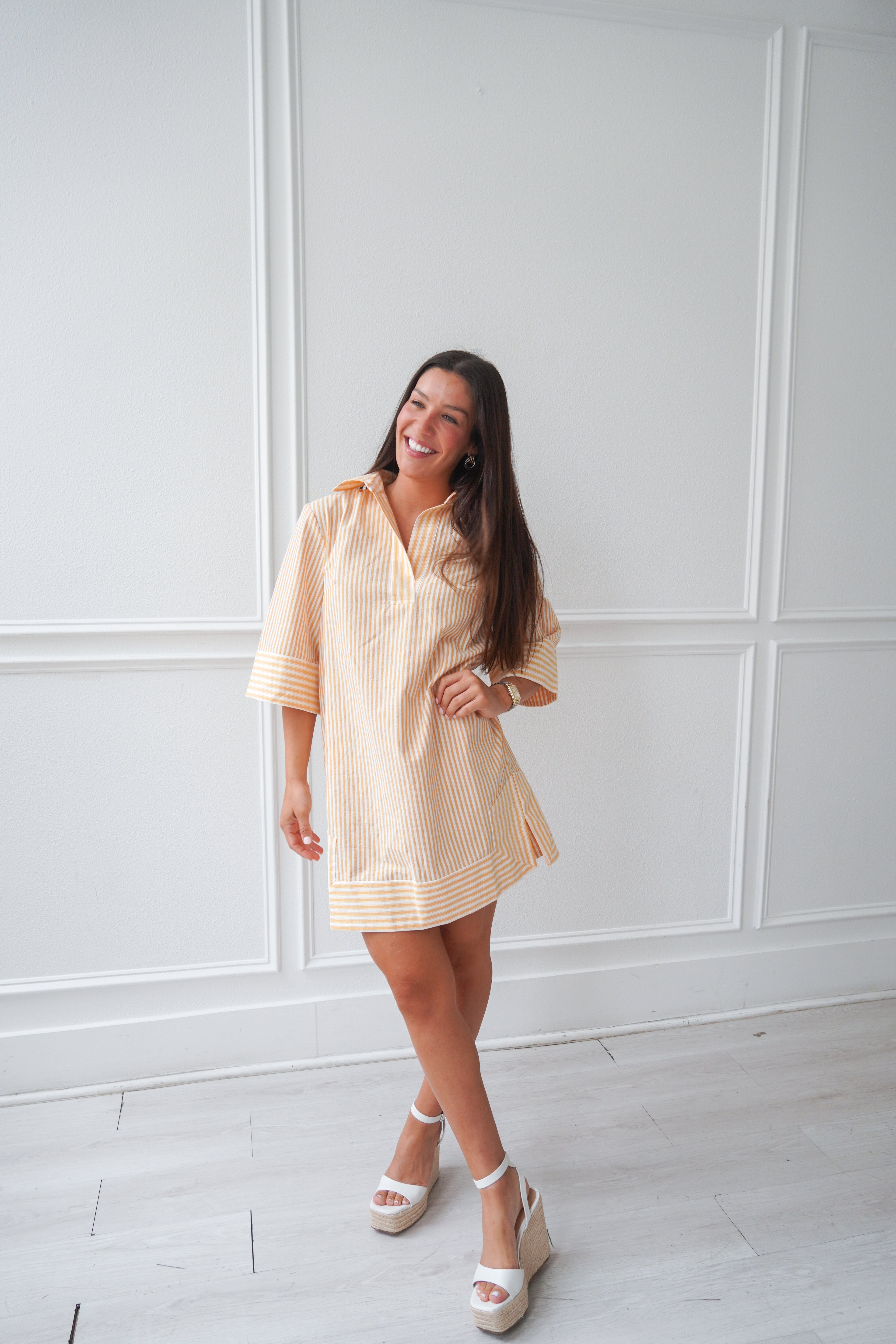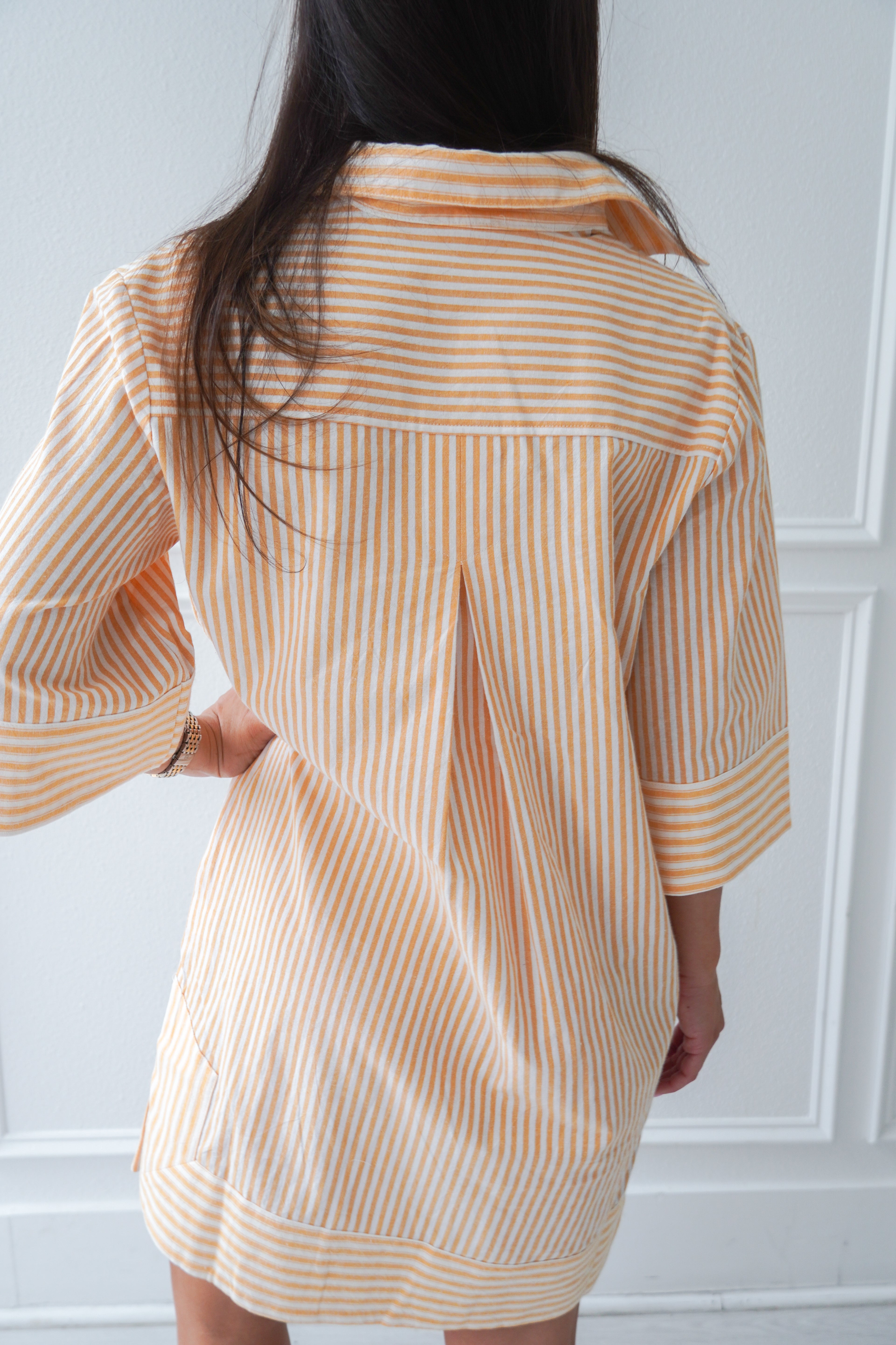 Featuring a light orange and white stripe, collared neckline and 3/4 length sleeves, this dress is breezy and light for Summer! Our pick for brunch, a beach coverup, or an easy everyday fit!